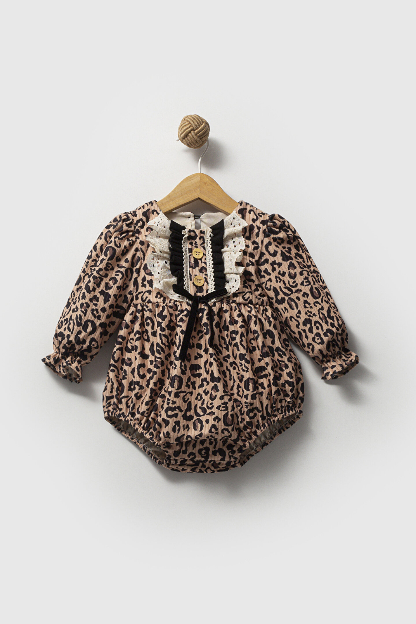 Baby Animals Kız Bebek Kız Çocuk Romper Doğum Günü Parti Düğün Leopar Romper Dantelli Fiyonklu Uzun Kol Romper