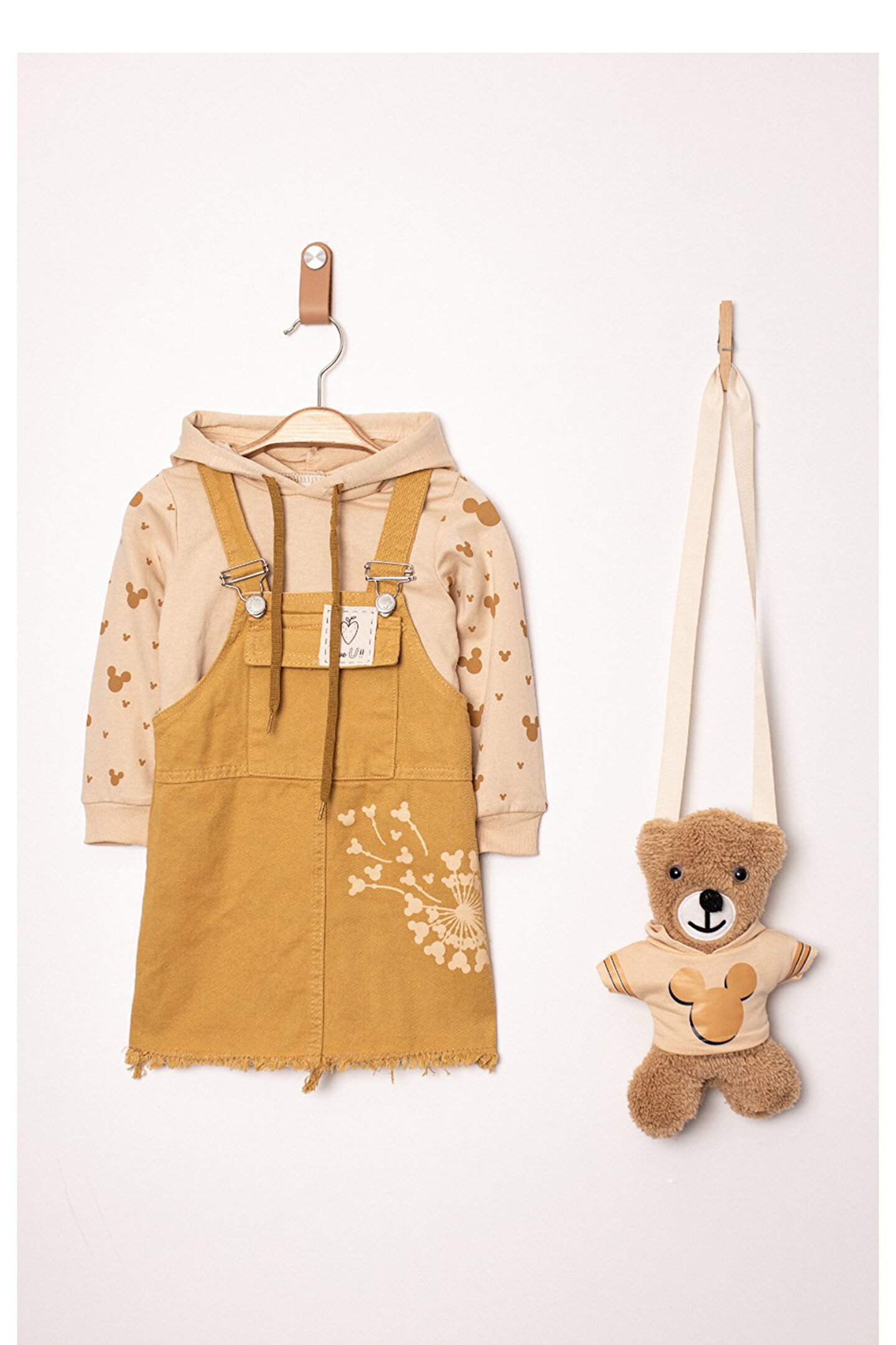Baby Animals Kız Bebek Kız Çocuk Salopet Slopet Bahçıvan Elbise 2 li Takım Uzun Kollu Çantalı Elbise