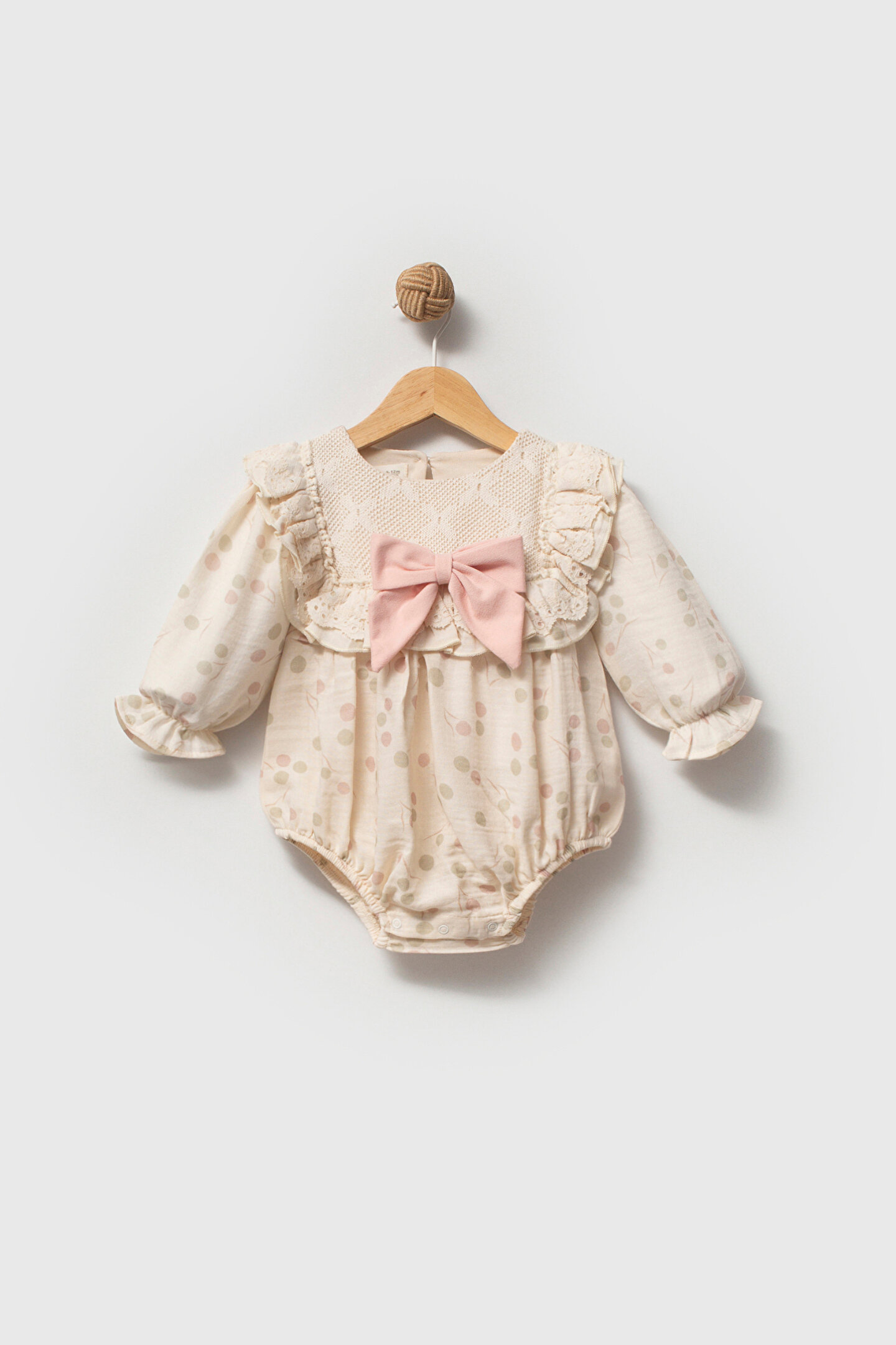 Mevsimlik Uzun Kollu Dantel Detaylı Kız Çocuk Elbise Romper: Küçük prensesinizin yaz mevsiminde özel günlerde zarafetini ve şıklığını ön plana çıkaracak bu elbise Romper, önünde bulunan fiyonk detayı ve dantel işlemeleriyle tasarlanmıştır.; Ayrıca etek kısmında bulunan yırtmaç detayı, hareket özgürlüğü sağlarken bebeğinizin zarif bir görünüm sergilemesini sağlar.; Özellikler: Dantel Detaylar: Elbisenin Romper ön kısmında ve kollarda bulunan dantel detaylar, zarafet ve incelik katarken, küçük prensesinizin görünümünü daha etkileyici hale getirir.; Önünde Fiyonk Detayı: Elbisenin ön kısmında bulunan fiyonk detayı, sevimliliği ve şıklığı artırır.; Küçük prensesinizin görünümüne hoş bir dokunuş ekler.; Yırtmaç Detayı: Etek kısmında bulunan yırtmaç detayı, hareket özgürlüğü sağlarken, elbisenin tasarımına dinamizm katar.; Uzun Kollu Tasarım:Rahatlıkla giyilebilecek Uzun kollu tasarım, bebeğinizin serin kalmasını sağlar ve özgürce hareket etmesine olanak tanır.; Mevsimlik Kullanıma Uygun: Hafif yapısı ve nefes alabilen kumaşıyla rahatlıkla giyilebilir.; Özel Günler İçin Uygun: Özel günlerde tercih edilebilecek şık tasarımıyla bebeğinizin her anında göz kamaştırmasını sağlar.; Bu yırtmaçlı, önü fiyonklu ve dantel detaylı Uzun kollu kız çocuk elbisesi Romper, küçük prensesinizin serin ve şık kalmasını sağlarken, aynı zamanda özel günlerde de zarafetini tamamlar.; Zarif detaylarıyla bezenmiş bu elbise Romper, bebeğinizin tarzını ve güzelliğini ön plana çıkarır.