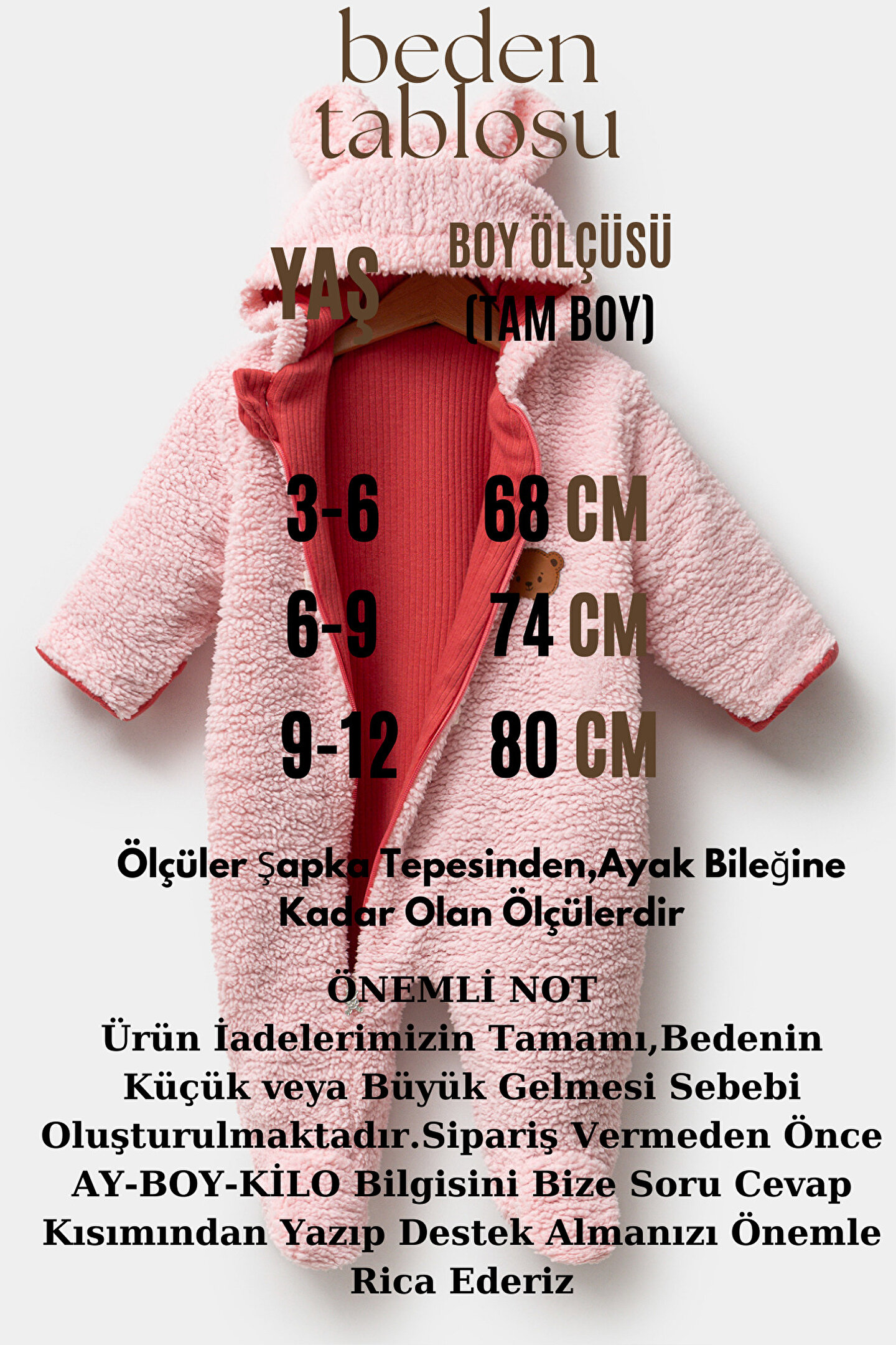 Hoş Polar Welsoft Kuzu kumaştan üretilen ve sevimli hayvan figürleriyle süslenmiş unisex Bebek Tulumlarımızla küçük çocuğunuzu hem rahat hem de sevimli tutun.; Bu tulumlar günlük kullanım için tasarlanmış olup bebeğinizin günlük maceraları için sıcaklık ve stil sağlar.; Unisex Çekiciliği: Bu tulumlar hem erkek hem de kız bebekler için uygundur, bu da onları günlük giyim için çok yönlü bir seçim haline getirir.; Günlük Konfor: Polar Welsoft Kuzu kumaştan üretilen bu tulumlar olağanüstü yumuşaktır ve bebeğinizin gün boyu rahat ve mutlu kalmasını sağlar.; Sevimli Hayvan Figürleri: Sevimli hayvan figürleriyle süslenen tulumlar, bebeğinizin kıyafetine eğlenceli ve sevimli bir dokunuş katıyor.; Uzun Kollu Üst: Tulumun uzun kollu üst kısmı, bebeğinize günlük aktiviteleri sırasında ekstra sıcaklık ve koruma sağlar.; Rahat Giydirme: Kolay giydirmek için tasarlanan bu tulumlar,fermuar kapamalara sahip olup, ebeveynlerin bebeklerini hızlı ve sorunsuz bir şekilde değiştirmelerini kolaylaştırır.; Çok Yönlü Günlük Giyim: İster oyun zamanı, ister geziler, ister evde rahat bir gün olsun, bu tulumlar çeşitli günlük aktiviteler için mükemmeldir.; Polar Welsoft Kuzu Kumaştan, Sevimli Hayvan Figürlü Uniseks Bebek Tulumlarımız, bebeklerinin günlük kıyafetlerinde hem rahatlığı hem de şıklığı ön planda tutan ebeveynler için tasarlandı.; 6 aydan 12 aya kadar olan bebekler için uygun olan bu tulumlar, günlük maceralar boyunca sıcak ve sevimli kalmalarını sağlıyor.; Bebeğinize hoş Polar Welsoft Kuzu kumaş ve büyüleyici hayvan figürleriyle rahat ve sevimli tulumlar giydirin.; Şimdi sipariş verin ve küçük çocuğunuz için her günü keyifli ve konforlu bir deneyime dönüştürün.
