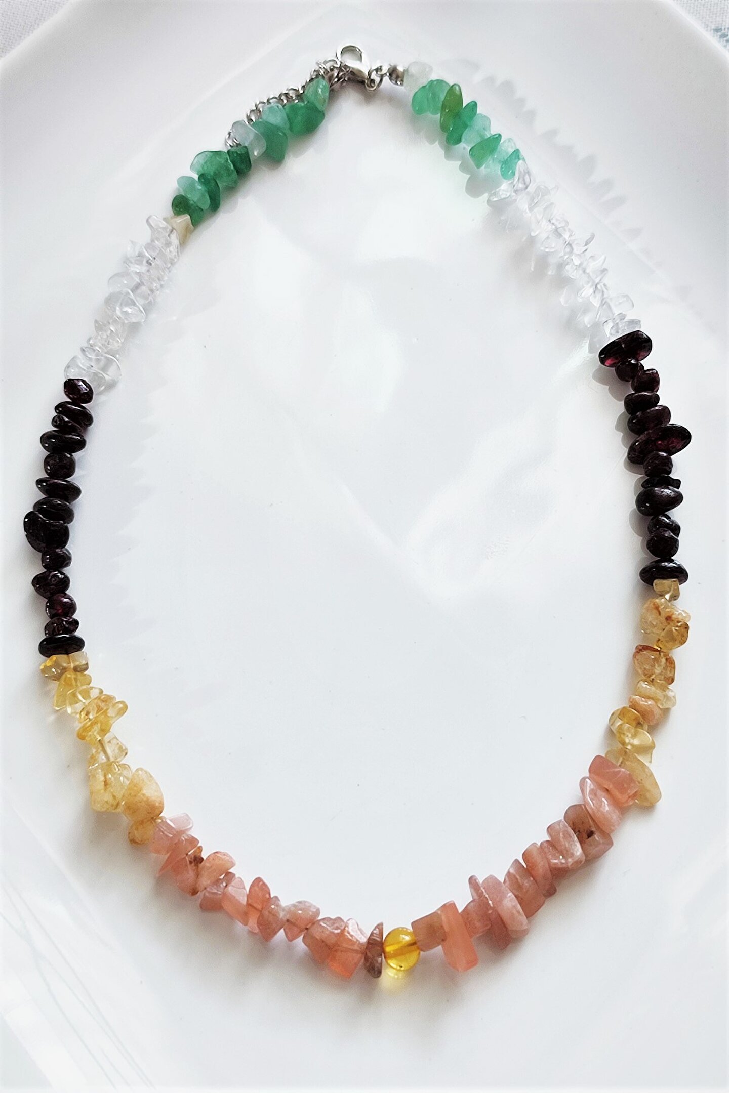 Doğal taşların eşsiz güzelliğini yansıtan bu kolye, kehribar, güneş taşı, sitrin, lal ve kristal kuvars gibi farklı renklerdeki taşlarla tasarlanmıştır; Her bir taşı özenle seçilmiş ve bir araya getirilerek, doğanın saf enerjisini boynunuzda taşıyabileceğiniz bir aksesuar oluşturulmuştur; Bu kolye, hem günlük kullanım hem de özel günler için ideal bir aksesuar olarak dikkat çeker; şıklığınızı tamamlayacak zarif bir dokunuş sunar; Doğal taşların benzersiz desenleri ve renkleriyle öne çıkan bu kolye, her kıyafetle uyum sağlayarak stilinizi yansıtmanızı sağlar;