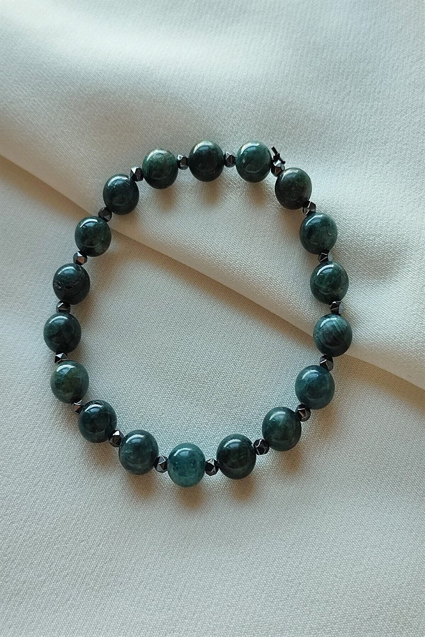 Doğal taş kullanımı, her bir bilekliğin benzersiz ve otantik bir görünüm kazanmasını sağlar; Sertifikalı apatit taşı, bilekliğin hem şık hem de dayanıklı olmasını garanti eder; 8 mm boyutundaki taşlar, bileklikte zarif bir doku ve estetik bir parlaklık sunar; Apatit taşı, enerji veren ve pozitif titreşimler yayan bir doğa taşıdır, bu da bilekliğin kullanıcıya huzur ve sakinlik hissi verir;
