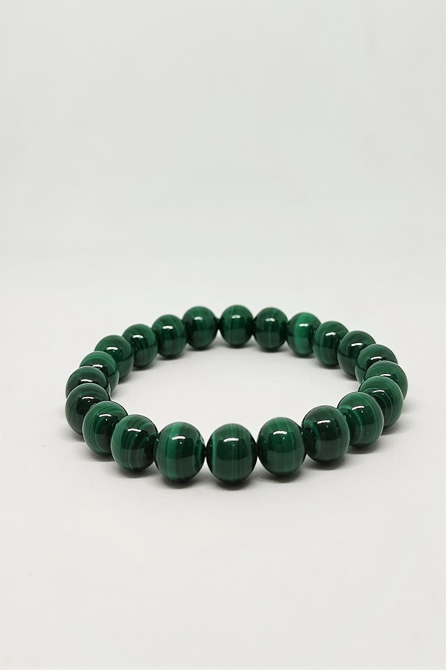 Doğal malahit taşı kullanılarak üretilmiş, şıklığı ve doğallığı bir arada sunan bileklik; Sertifikalı malahit taşı ile kalite ve güvenilirlik garantisi; 8 mm boyutundaki taşlar, zarif ve modern bir görünüm sağlar; Her bilek boyutuna uyum sağlayacak esnek tasarım;