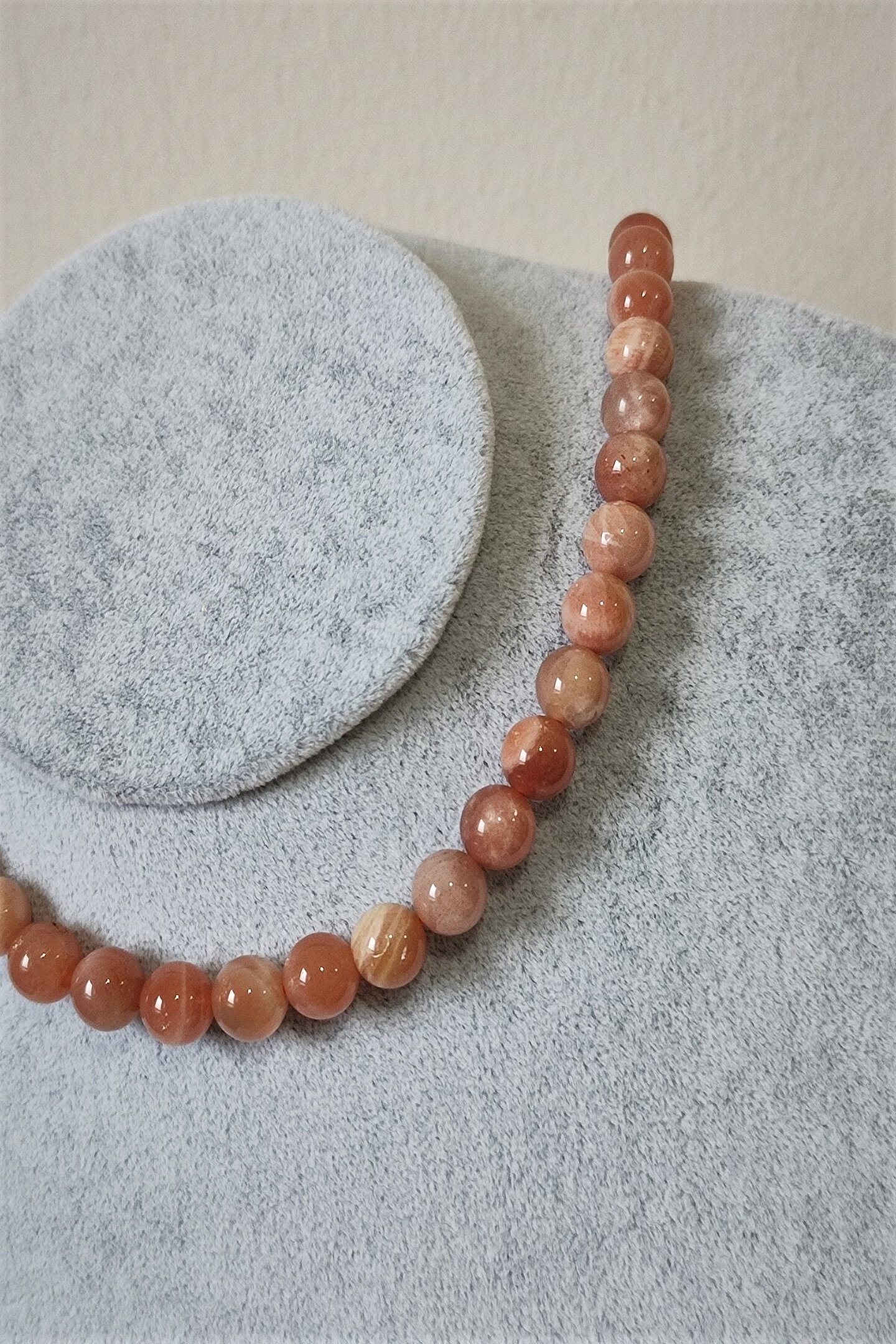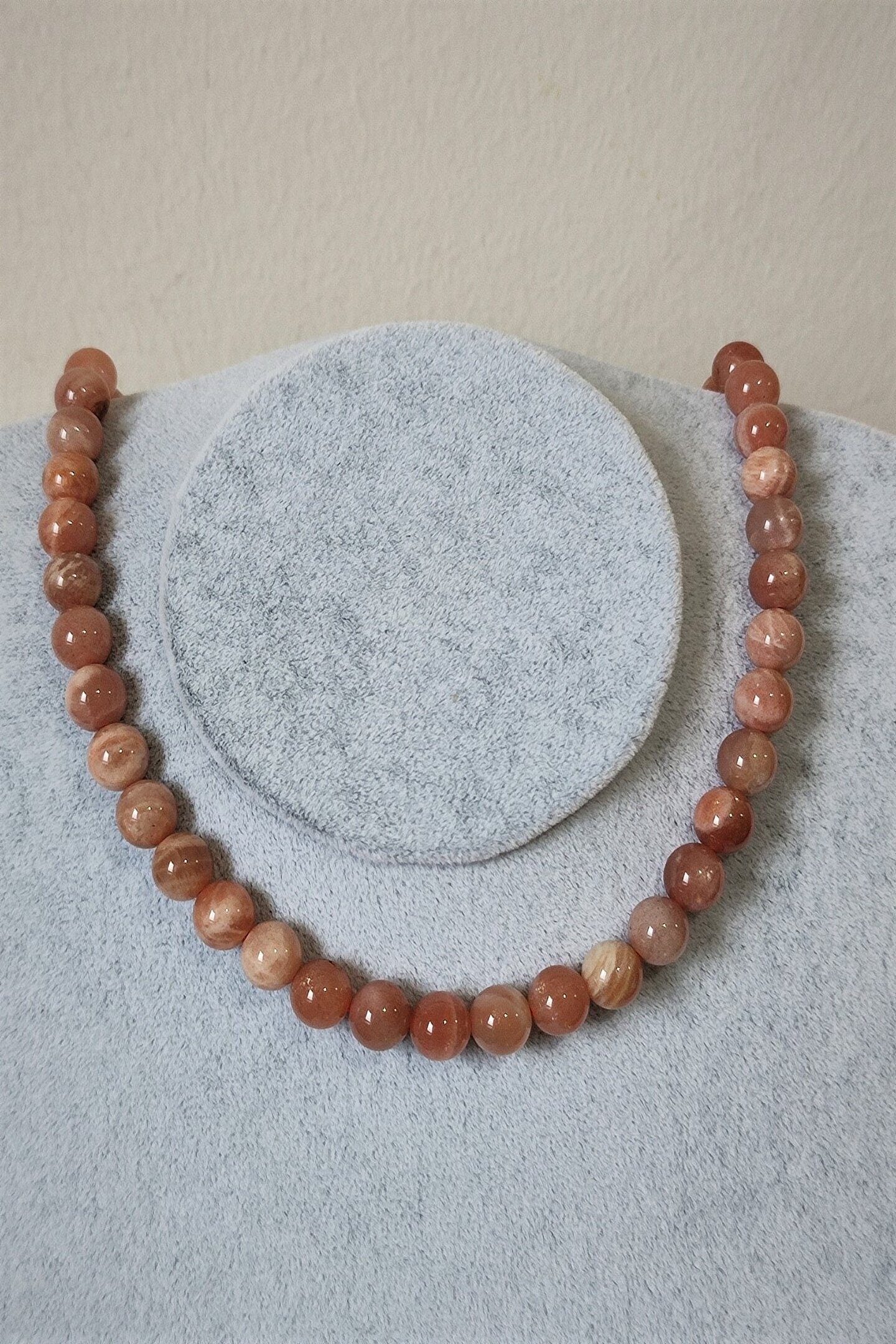 Doğal güneş taşı kullanılarak üretilmiş, her biri benzersiz ve özgün bir tasarıma sahip kolye; Sertifikalı doğaltaş kullanımı ile kalite ve güvenilirlik sunar; 8 mm boyutundaki taşlar, zarif ve şık bir görünüm sağlar; Günlük kullanım için idealdir; hem rahatlığı hem de estetiği bir arada sunar;