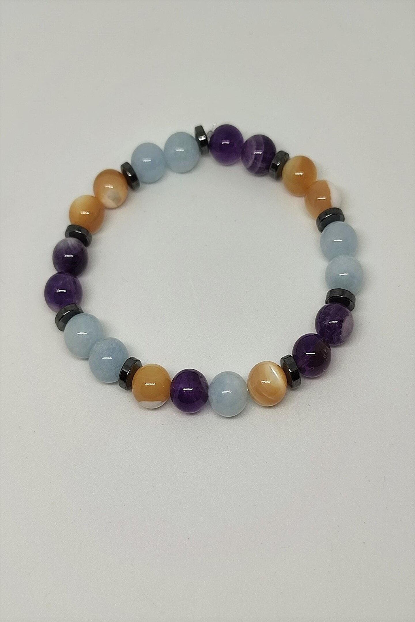Akuamarin, esmer sedef ve ametist gibi doğal taşların birleşimiyle tasarlanmış, şıklığı ve doğallığı bir arada sunan bir bileklik; Sertifikalı akuamarin, esmer sedef ve ametist taşları kullanılarak üretilmiş olup, kalite ve özgünlük konusunda güven verir; Hematit doğaltaşının eşsiz tonları ile zenginleştirilmiş bu bileklik, her türlü kıyafetle uyum sağlayacak zarif bir aksesuar seçeneği sunar; Doğal taşların benzersiz dokusu ve renkleriyle dikkat çeken bu bileklik, hem günlük kullanım hem de özel günler için idealdir;