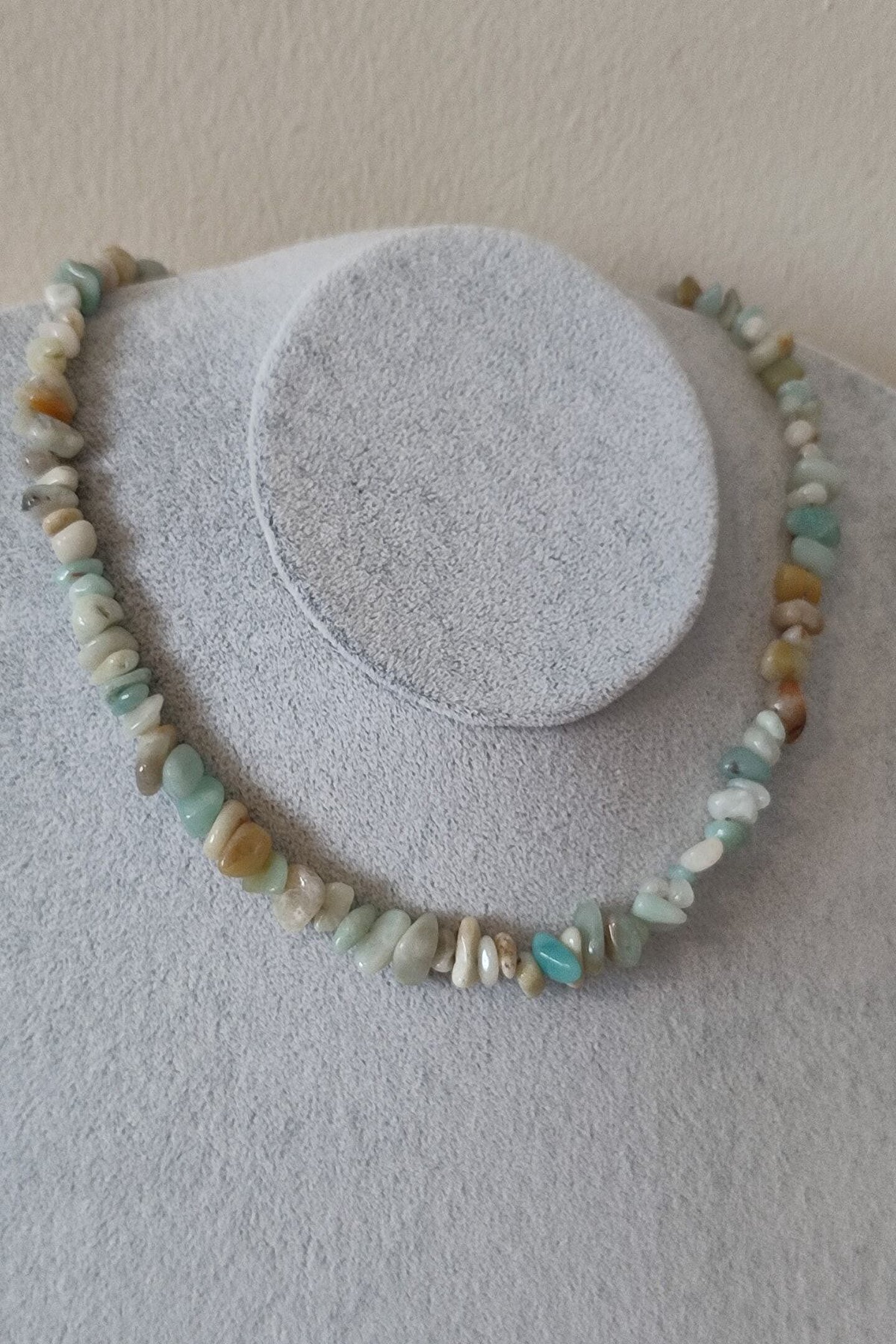 - Doğal taş kullanımı sayesinde her kolye benzersiz ve otantik bir görünüm sunar; - Amazonit kırıktaş doğaltaş, kolyenin hem şık hem de dayanıklı olmasını sağlar; - Bijuteri kolye, günlük kullanım için idealdir ve her türlü kıyafetle uyum sağlar;