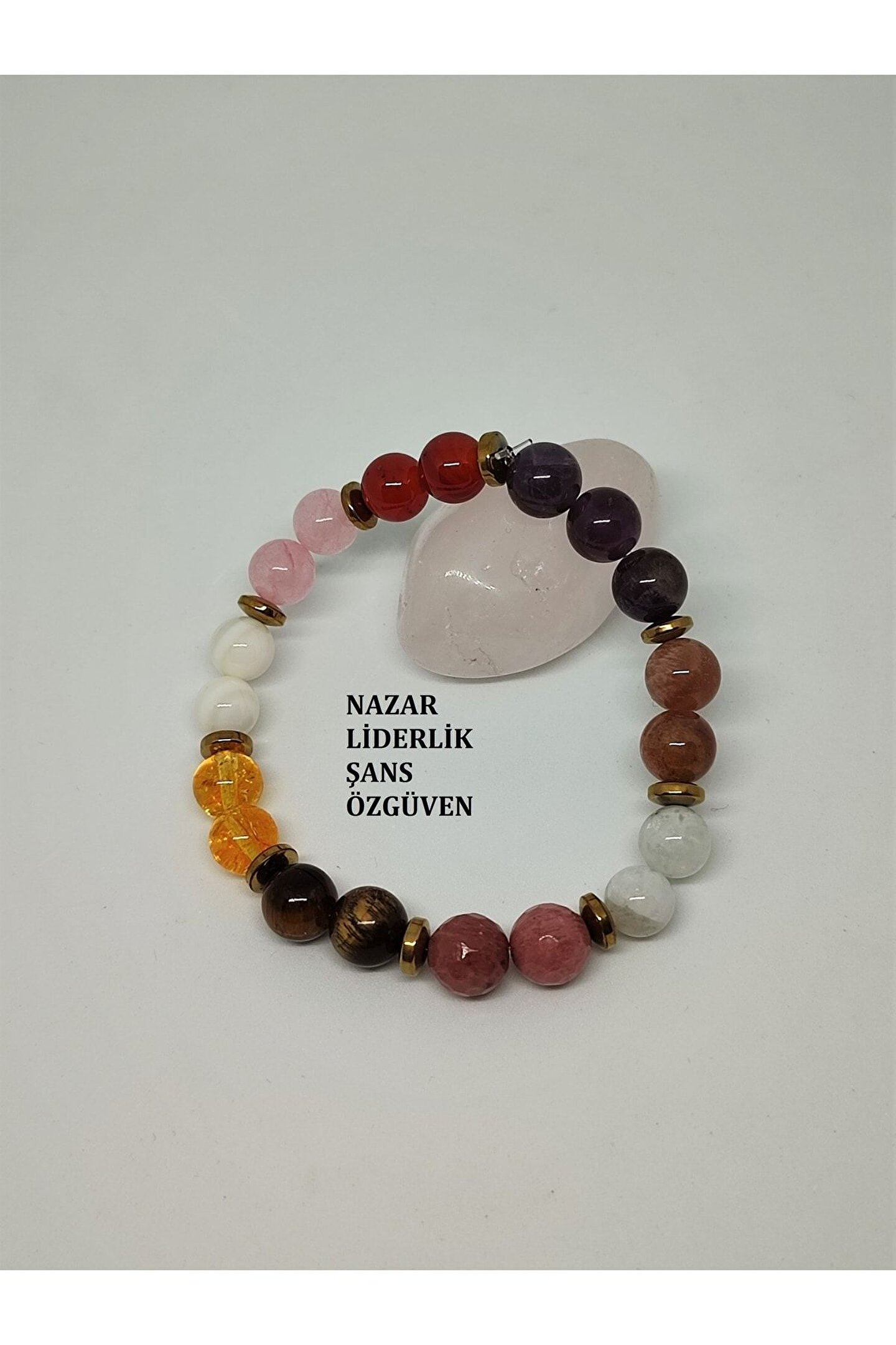 Doğal taşların şıklığını ve enerjisini bileğinizde hissedin: Bu bileklik, sertifikalı ametist, güneş taşı, ay taşı, pkuvars, akik, hematit, sitrin, sedef ve rodonit gibi farklı türlerdeki doğal taşlardan oluşur; Her bir bileklik, benzersiz bir doğa harikası sunar: Her bir bileklik, doğanın sunduğu farklı renk ve desenlerdeki taşlarla tasarlanmıştır, böylece her bir parça size özel bir deneyim sunar; Doğal taşların pozitif enerjisi ile stilinizi tamamlayın: Bu bileklikler, doğal taşların sunduğu pozitif enerjilerle stilinizi tamamlamanızı sağlar ve günlük hayatınızda size destek olur; Kaliteli malzeme kullanımı: Bileklikler, yüksek kaliteli malzemelerden üretilmiştir ve uzun süreli kullanım için dayanıklılık ve estetik görünüm sunar; Özel tasarım: Her bir bileklik, el işçiliği ile özenle tasarlanmıştır ve her bir parçanın benzersizliği, kişisel tarzınıza özgünlük katar;