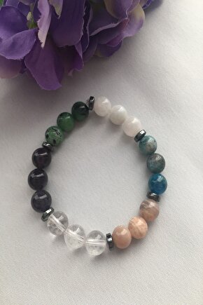 Doğal taş bileklik, şıklığı ve doğallığı bir arada sunar; Sertifikalı anyolit, ay taşı, apatit, güneş taşı, kristal kuvars, ametist ve hematit gibi değerli taşlarla tasarlanmıştır; Her bir bileklik, benzersiz ve özgün bir görünüm kazandırarak kişisel tarzınızı yansıtır; Doğal taş kullanımı sayesinde her bileklik, her cilt tipine uygun bir dokunuş sağlar ve cildinizle uyum içinde olur; Bu bileklikler, hem günlük kullanım hem de özel günler için ideal bir aksesuar seçeneği sunar;