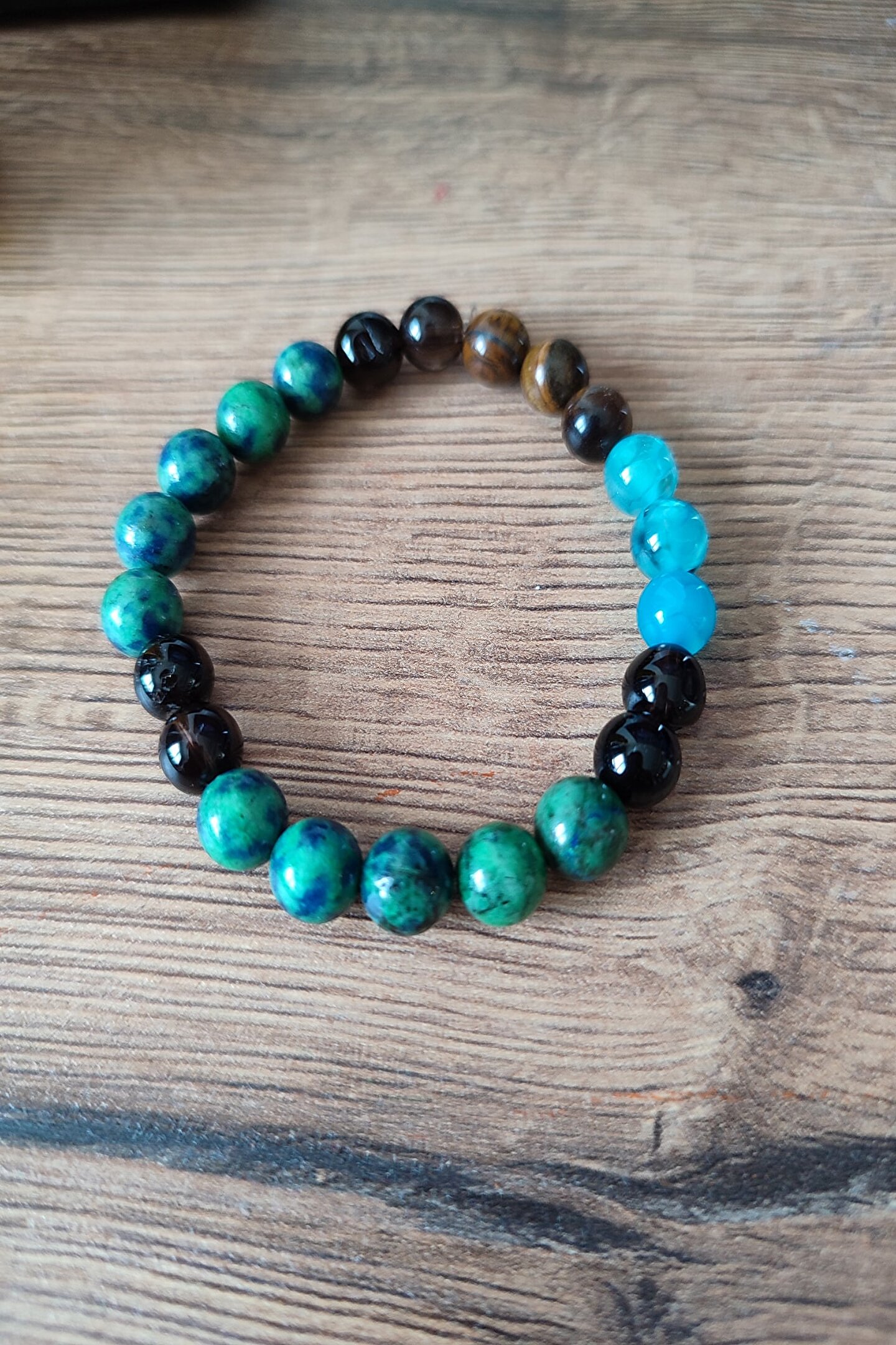 - Doğal taş kullanımı, her bir bilekliğin benzersiz ve otantik bir görünüm kazanmasını sağlar; - Sertifikalı azurit, dumanlı kuvars ve kaplangözü gibi değerli taşlar, bilekliğe zarif bir parlaklık ve estetik bir dokunuş katar; - Bu bileklik, hem günlük kullanım hem de özel günler için ideal bir aksesuar seçeneği sunar; - Doğal taşların şık ve göz alıcı renkleri, bilekliğin her türlü kıyafetle uyum sağlamasına olanak tanır;