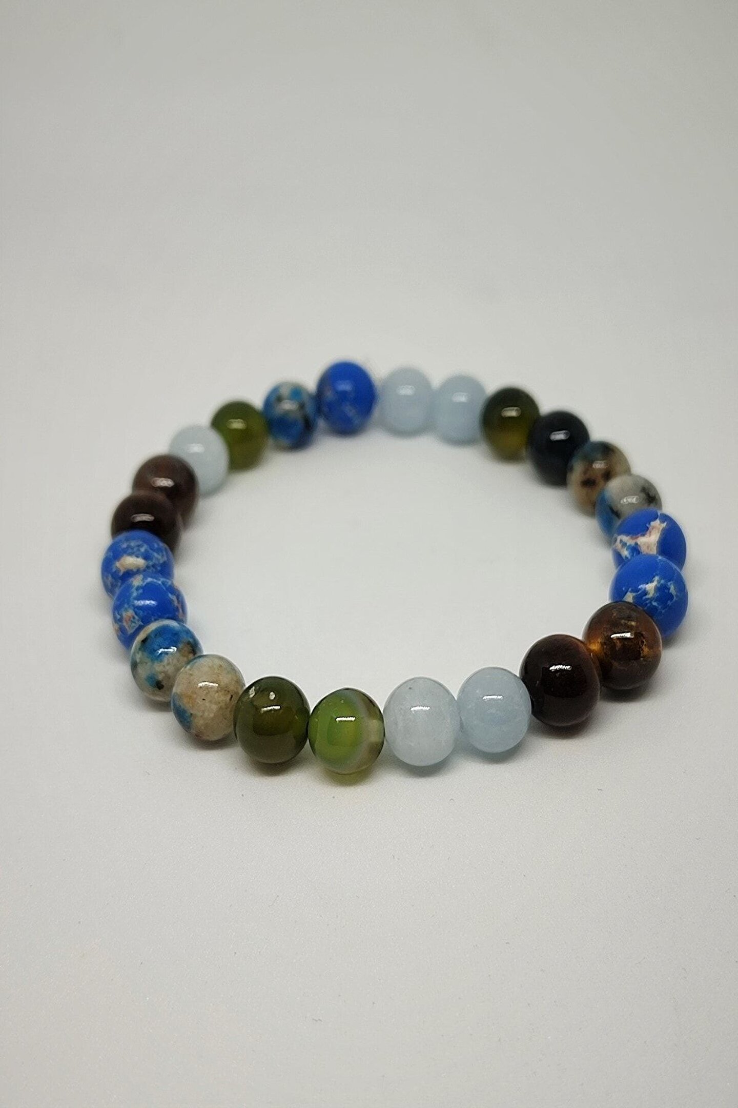 Doğal taş kullanımı sayesinde her bileklik benzersiz ve özgün bir görünüm sunar; Akvaryum balığı taşı olarak da bilinen akuamarin, enerjiyi dengelemeye yardımcı olur ve stresi azaltır; Akik taşı, duygusal dengeyi sağlayarak duygusal sağlığı destekler ve rahatlatıcı bir etki yaratır; Varasit taşı, yaratıcılığı artırır ve zihinsel netliği destekler; Dumortireit kaplangözü taşı, fiziksel ve zihinsel yorgunluğu azaltarak enerji seviyelerini yükseltir;