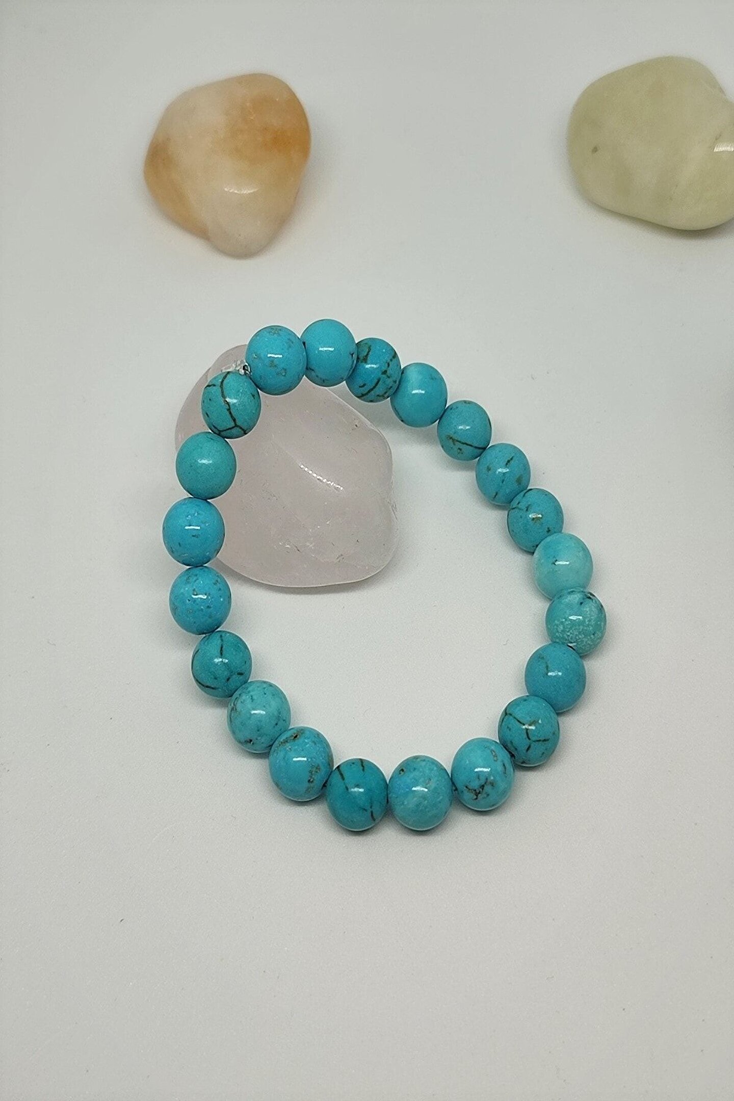 Doğal turkuaz firuze taşı ile tasarlanmış, her bir bileklik benzersiz ve özgün bir görünüm sunar; Sertifikalı gerçek taş kullanımı, ürünün kalitesini ve orijinalliğini garanti eder; Bijuteri bileklik, zarif tasarımıyla günlük kullanım için idealdir ve şıklığınızı tamamlar; Doğal taşların eşsiz renk ve desenleri, her kıyafetle uyum sağlayarak stilinizi öne çıkarır;