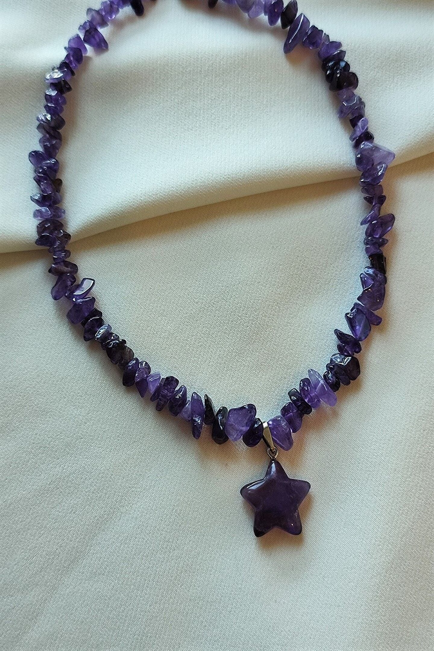- Doğal taş kullanımı sayesinde her kolye benzersiz ve otantik bir görünüm sunar; - Koyu ametist yıldız kırıktaş doğaltaş, şıklığı ve zarafeti bir arada barındırır; - Bijuteri kolye tasarımı, modern ve trend bir stil ifade ederken aynı zamanda geleneksel dokunuşları da yansıtır;