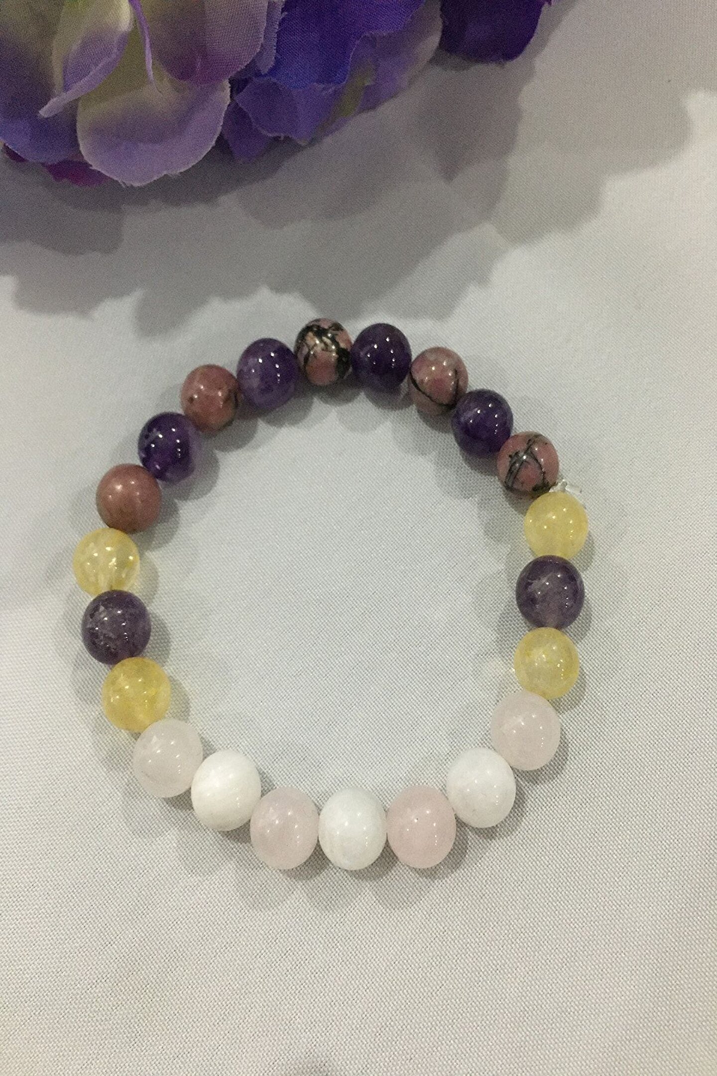 - Doğal taş bileklik, şıklığınızı tamamlayacak zarif bir aksesuardır; - Sertifikalı sitrin, rodonit, ametist ve pembe kuvars gibi değerli taşlarla süslenmiştir; - Ay taşı detayı ile göz alıcı bir görünüm sunar ve her türlü kıyafetle uyum sağlar; - Doğal taş kullanımı sayesinde her bileklik benzersizdir ve doğanın güzelliklerini bileğinizde taşımanızı sağlar;