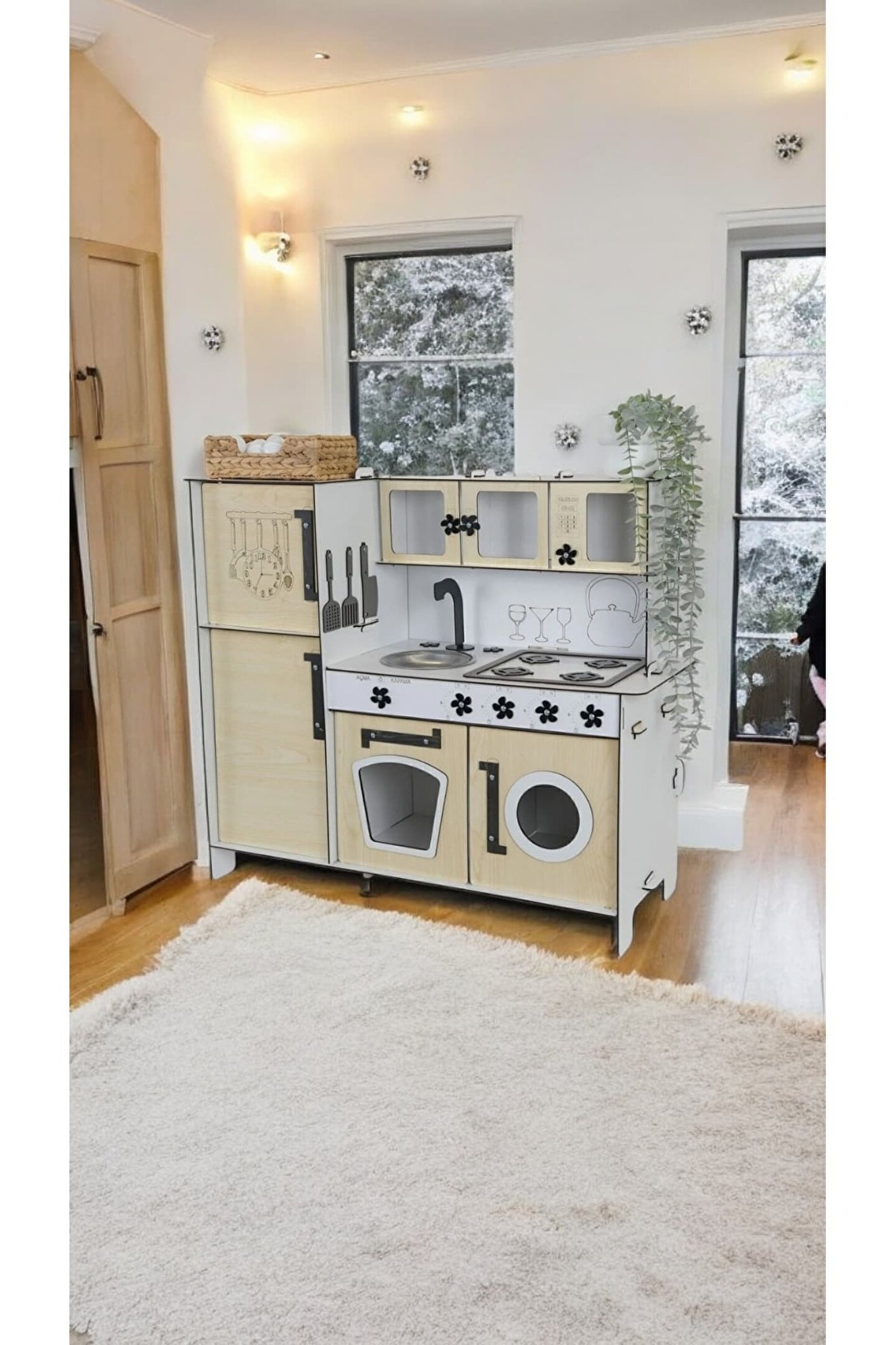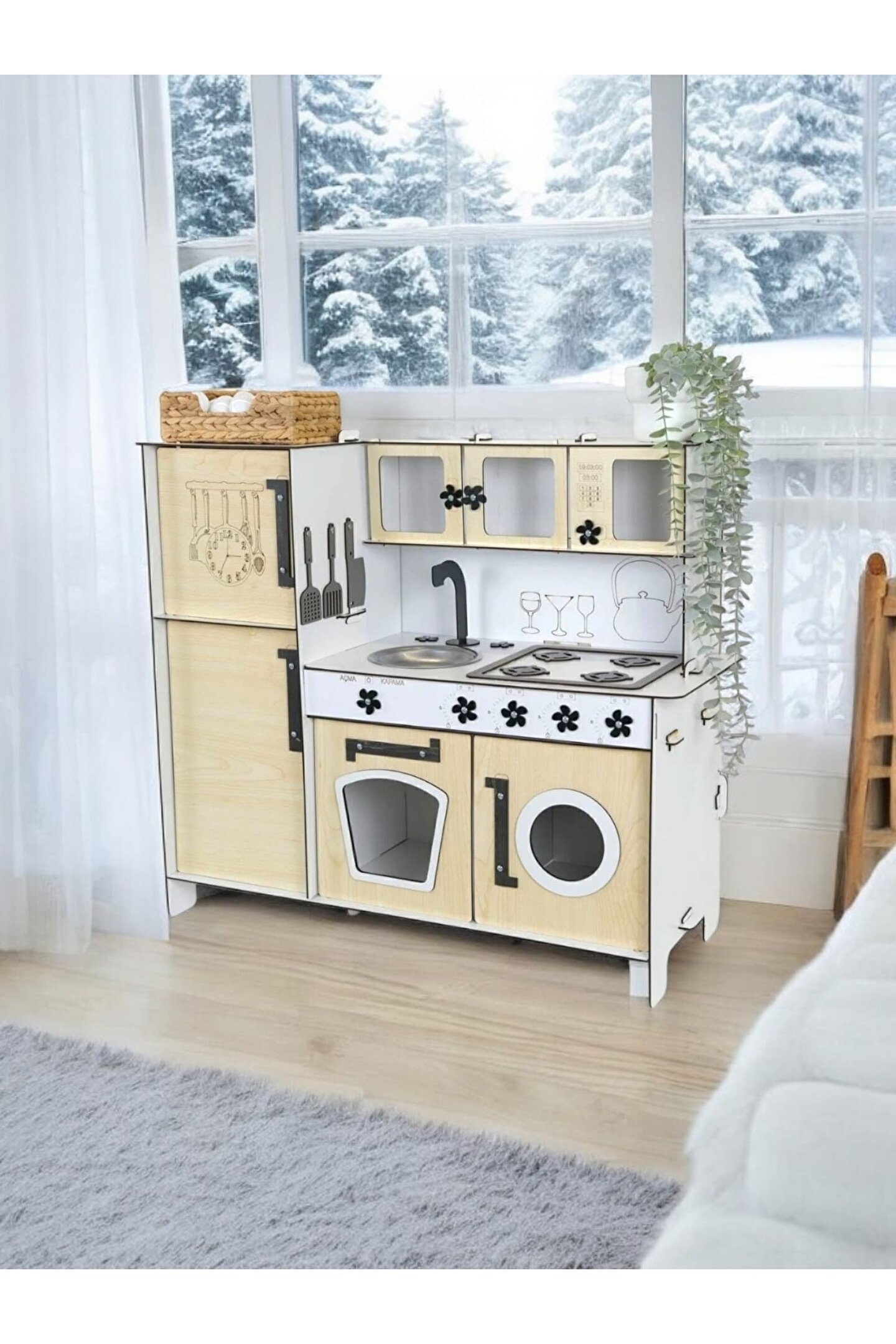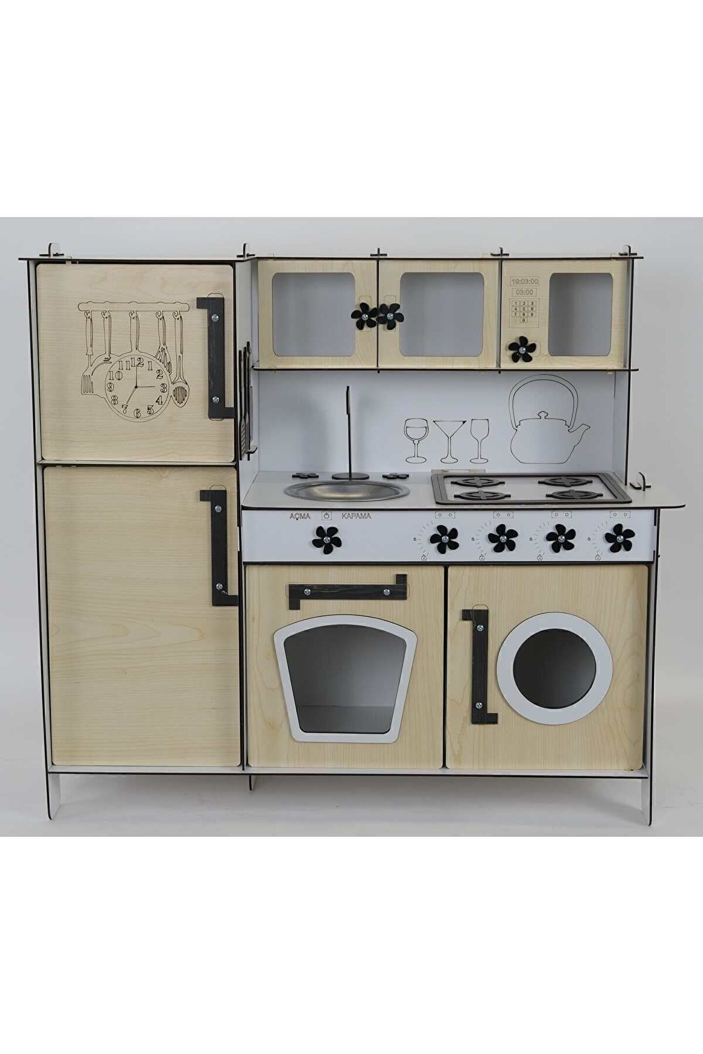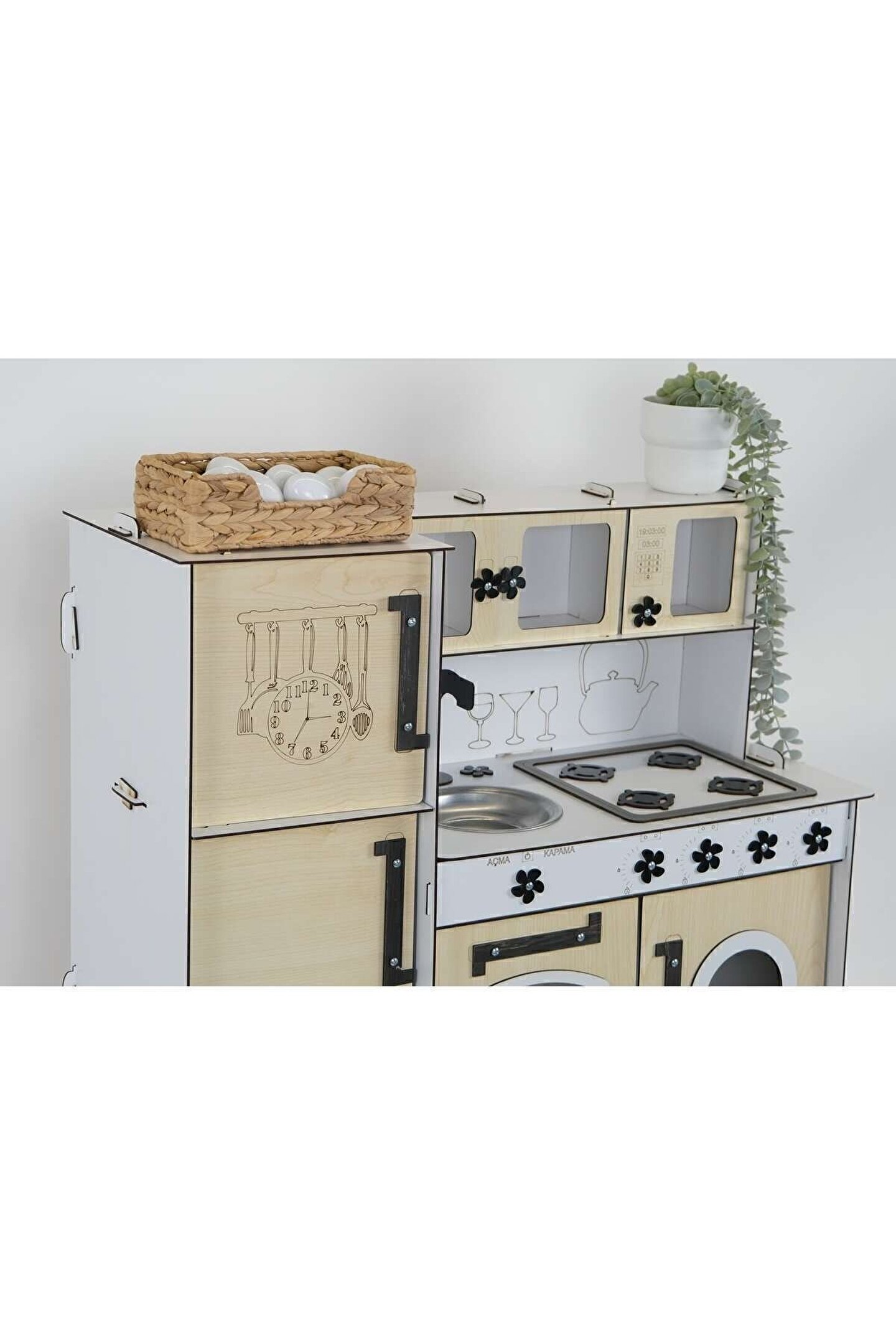Yükseklik 70 cm. Genişlik 80 cm. ; Malzemesi 1. Sınıf 3 mm ÇİFT YÜZ MDF'dir. ; Doğum günü hediyesi olarak tercih edilen ürünler arasındadır. Evcilik oyuncakları , oyuncak mutfak setleri, eğitici oyuncaklar , kız çocuk oyuncakları alanında tercih edildiği gibi erkek çocuklar içinde oldukça talep gören bir oyuncaktır. ; Montessori etkinlikleri ne uygun olarak tasarlanmıştır, çocuklarının hayal gücünü ve motor becerilerini geliştirir. ; Bu ürün 3mm'dir. 6mm ürün için "Ahşap Oyuncak Mutfak 6mm olarak inceleyebilirsiniz, inceymiş açıklaması ile iade kabul edilmemektedir, 3 mm olarak binlerce kişi memnun kullanmaktadır. Paket içerisinde kurulum kılavuzu vardır yine de kurulum esnasında sorularınız olursa kılavuzun arkasındaki numaradan ulaşabilirsiniz. ; Kargoda hasar görmemesi için özenle paketlenmektedir, olası bir hasar durumunda parçalar ücretsiz olarak kargo edilir. Boyalı olduğundan boya için ayrıca uğraşma gerektirmez sadece kurulum yaparak kullanıma başlayabilirsiniz. 9 renk alternatifi vardır tercih ettiğiniz renk üzerinden sipariş verebilirsiniz.