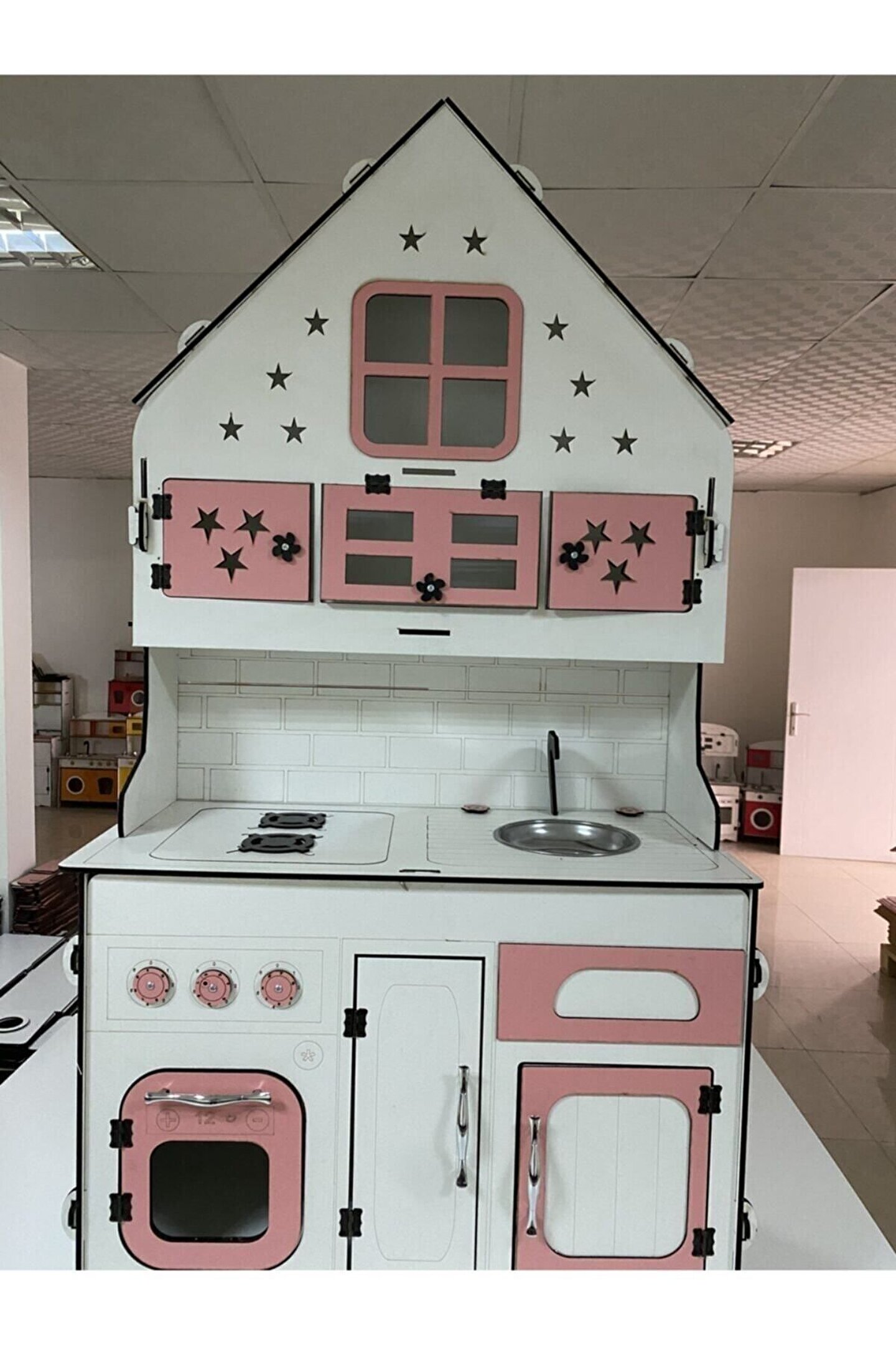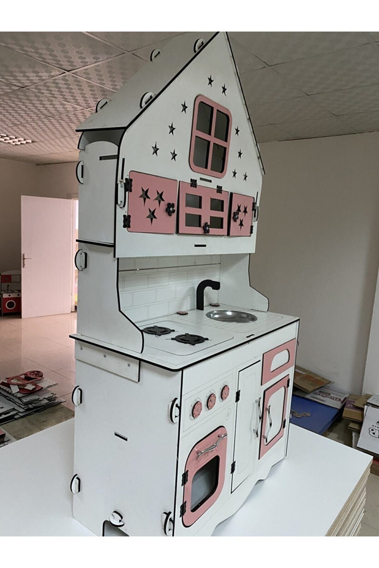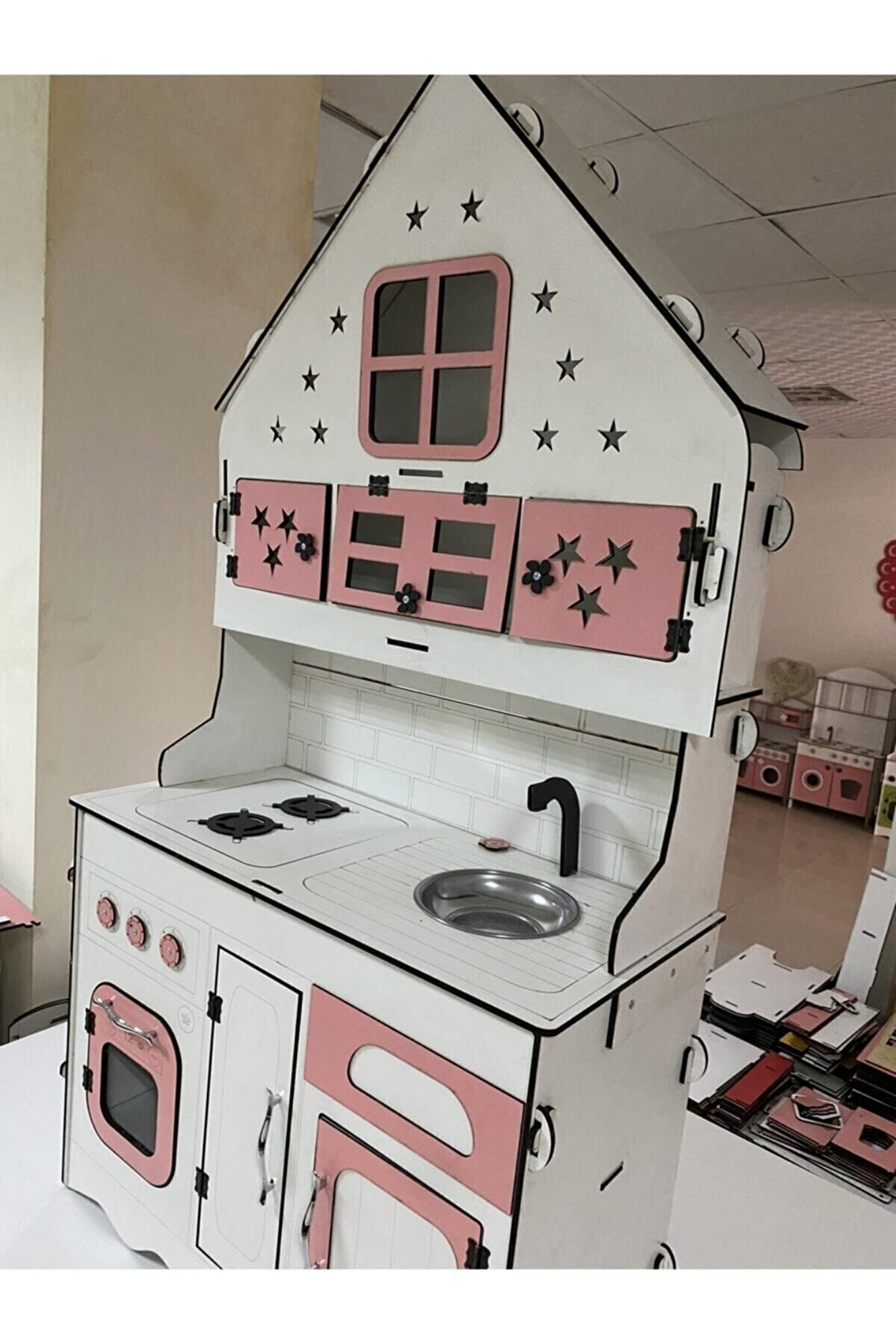 Ürün kendi tasarım ve kendi imalatımızdır piyasada eşi benzeri yoktur yüksekliği 145 cm eni 77 cm dir. ; Çocukların rahatlıkla ayakta oynayabileceği boyuttadır. ; Ürün 6.4 mm orijinal MDF'den üretilmektedir sağlam ve dayanıklıdır. ; İsteğe göre ışık takılabilir, çatı katındaki pencere ve yıldızlardan ışık çıkıyor ışıklı model fiyatı +125 TL'dir. Ürünümüzde kargoda veya kurulum sırasında kırılma olursa parça firmamız tarafından ücretsiz gönderilmektedir. ; Çocukların motor becerileri ve hayal güçleri gelişimini destekleyen harika tasarım gelişim oyuncağıdır ; Ürünümüzü sipariş verdikten sonra msj ile renk belirtebilirsiniz, renk belirtilmezse görseldeki ürünün aynısı gönderilir. ; Doğum günü hediyesi olarak tercih edilen ürünler arasındadır. Evcilik oyuncakları , oyuncak mutfak setleri, eğitici oyuncaklar , kız çocuk oyuncakları alanında tercih edildiği gibi erkek çocuklar içinde oldukça talep gören bir oyuncaktır. ; Not; ürün özellikleri, ölçüler ve kullanılan malzemeler açıkça belirtilmiştir. Ürün iadesi kabul edilmemektedir buna göre sipariş verilmesini rica ederiz ;