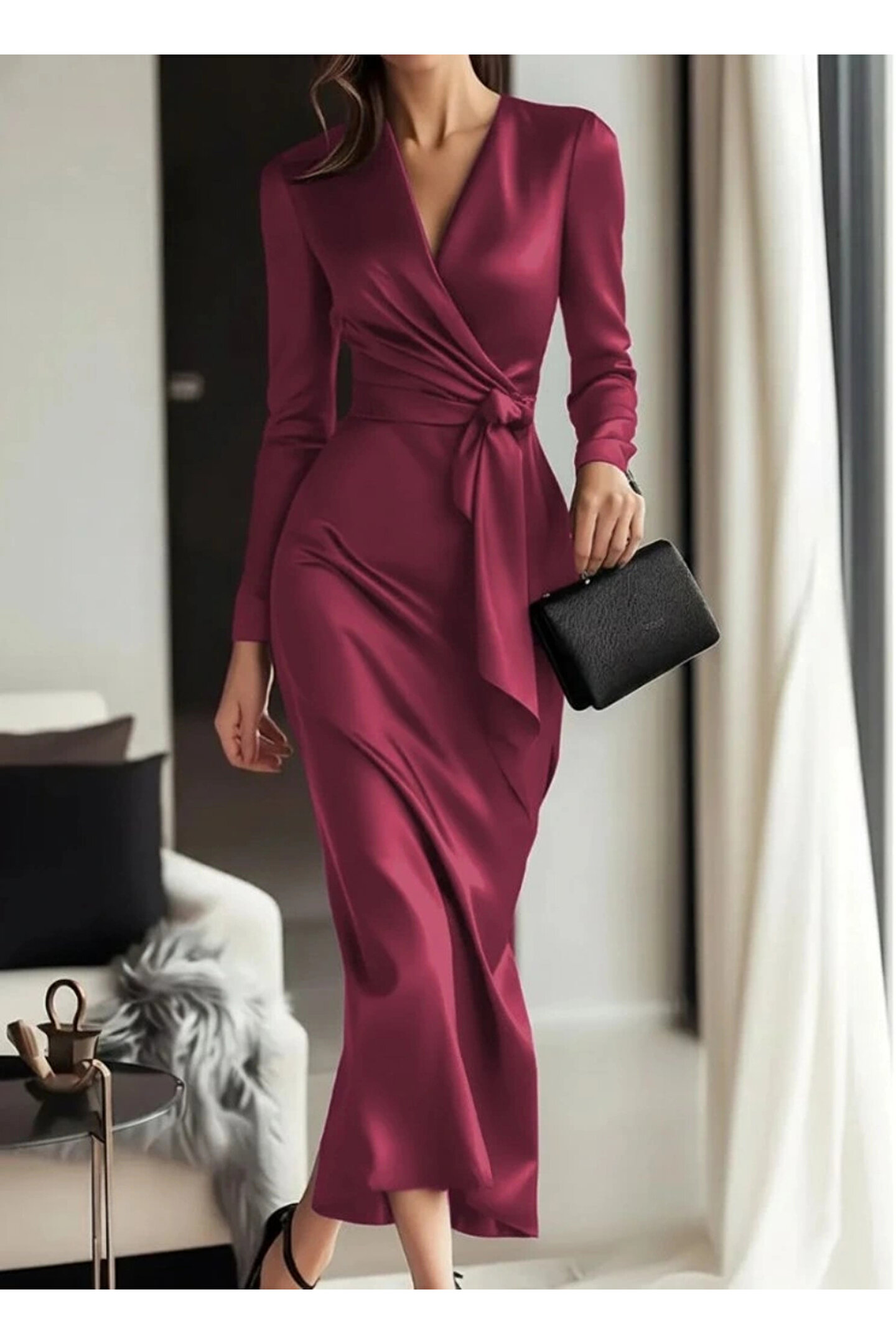 Kadın Uzun Kollu Kruvaze Yakalı Beli Kuşaklı Uzun Saten Elbise