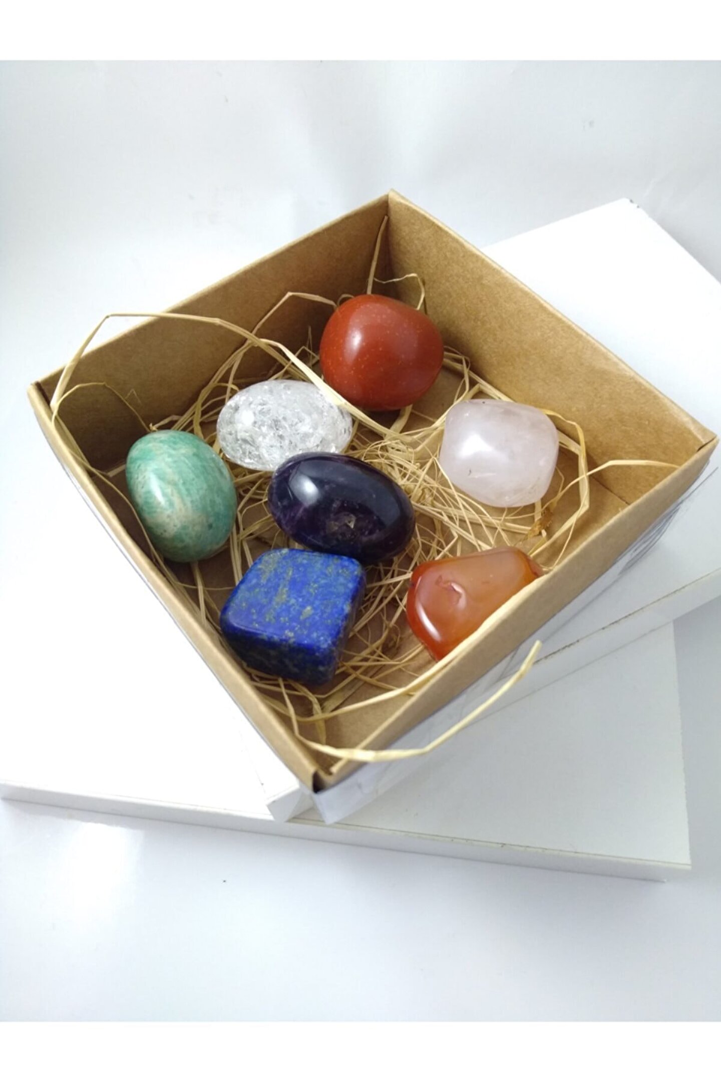 ÇAKRA TAŞLARI / 7 ÇEŞİT DOĞALTAŞ BİBLO Çakralar, bedenimizde bulunanenerji merkezleridir. Çakra sistemindeki temel amaç bedenin enerji merkezlerini harekete geçirereksağlıklı çalışmasını sağlamak, ruhsal ve bedensel bütünlüğü oluşturmaktır. Çakra taşları, değişik 7renkten oluşur. Her bir renk bir çakra katmanını simgeler. Ürünün Özellikler i; Fiyata 7çeşit doğaltaş dahildir. Üründekullanılan doğaltaşlar; ametist, lapis lazuli, aventurin, akik ve pembe kuvars,kristal kuvars ve jasper’dır. Taşlarfotoğrafta görünen kutu ile birlikte gönderilmektedir. Taşlar toplam 90/100 grarasıdır.