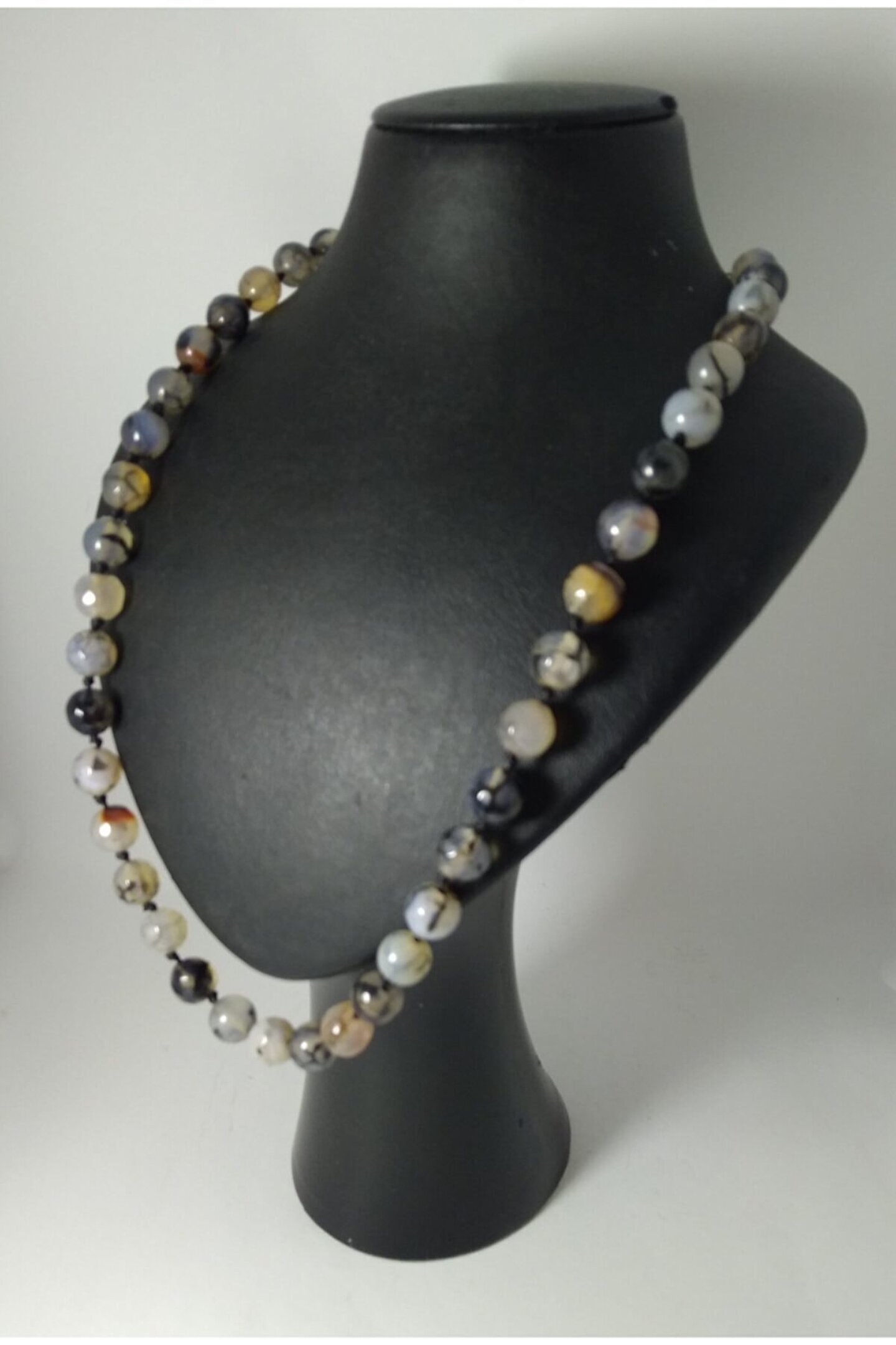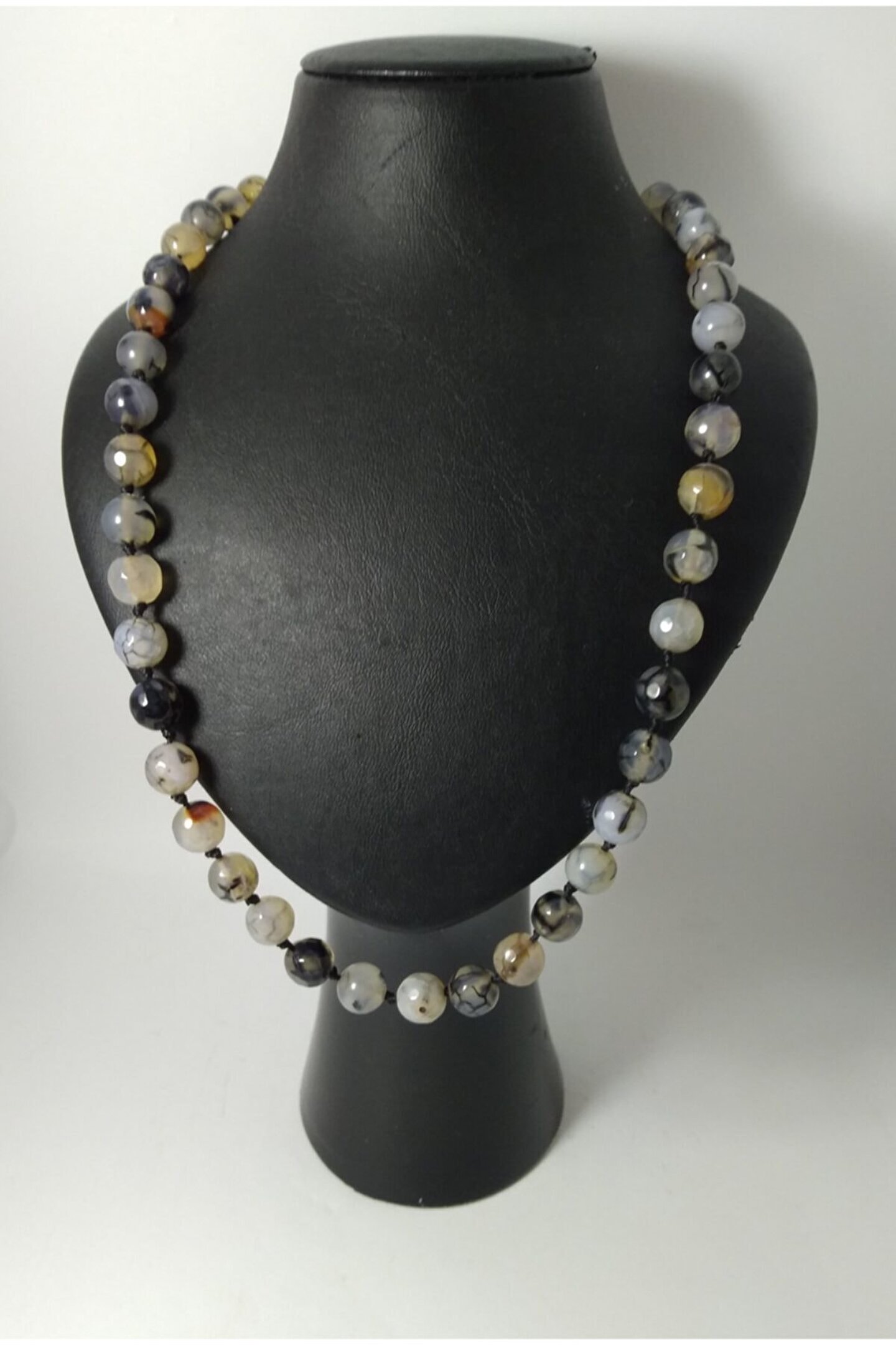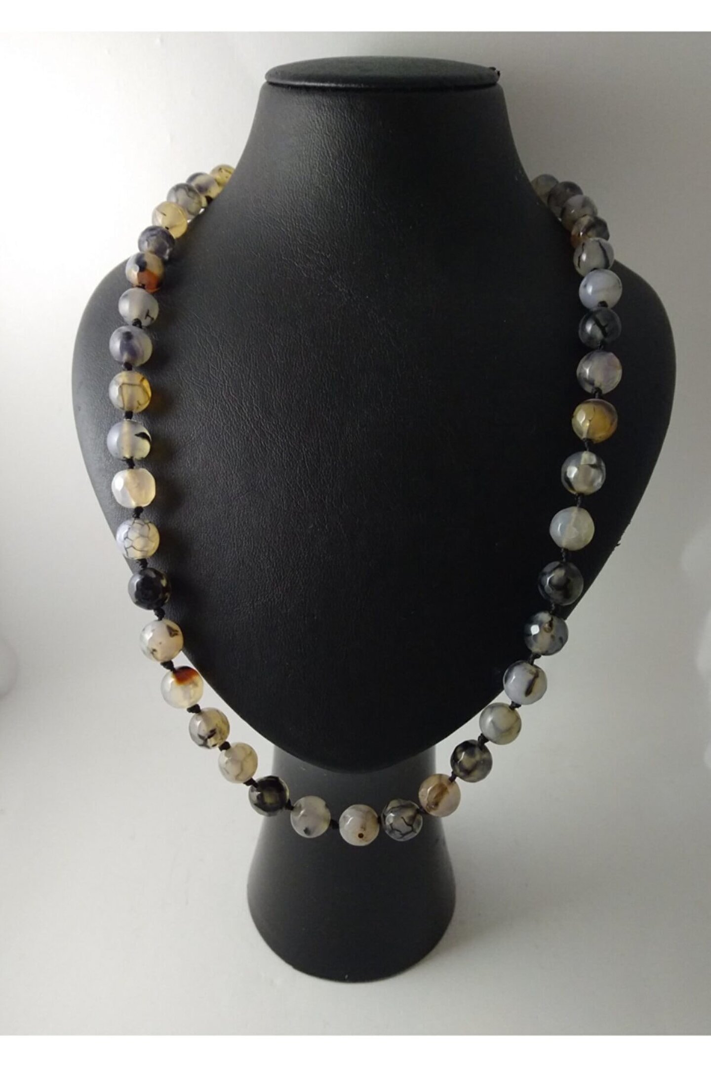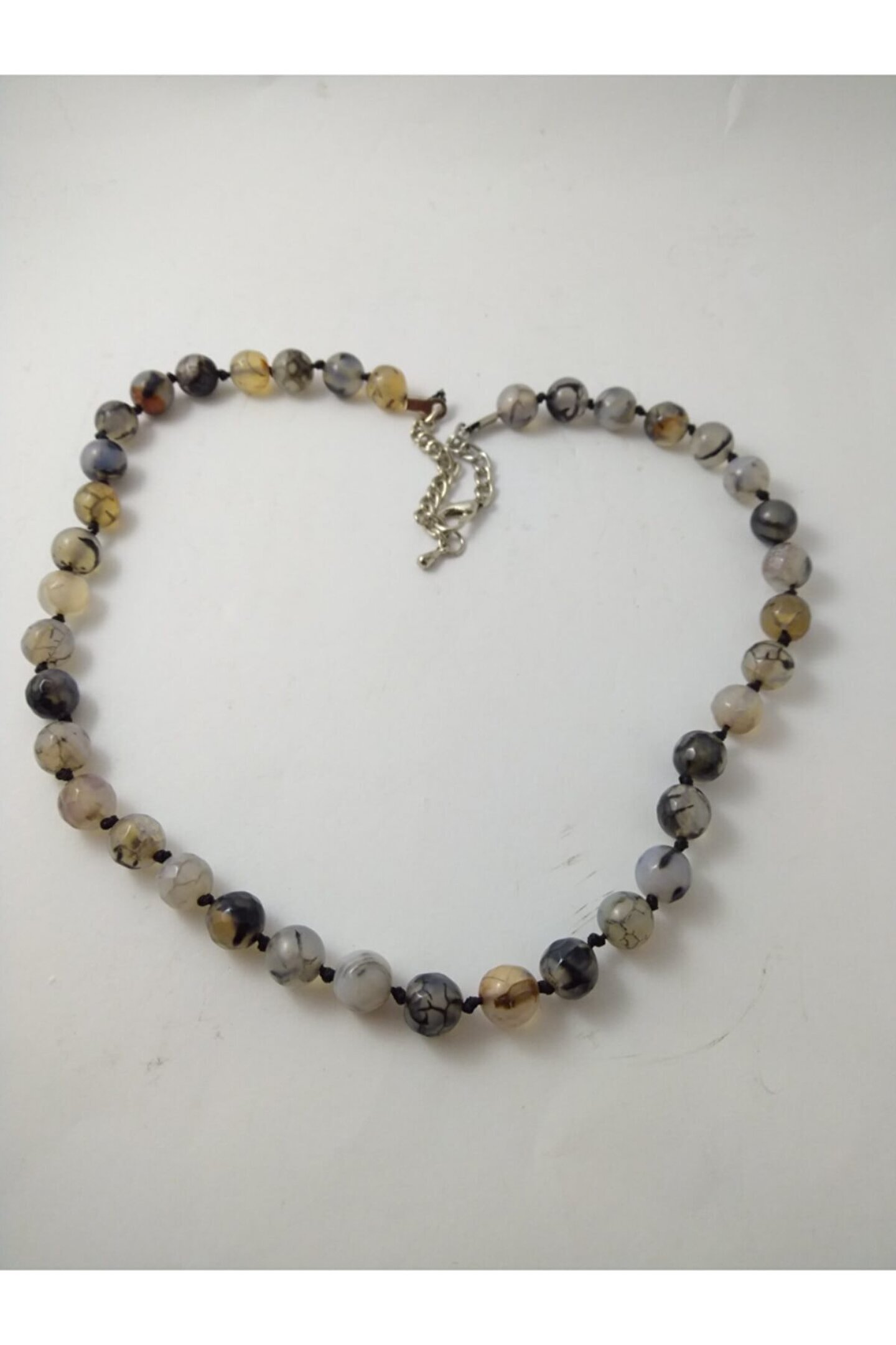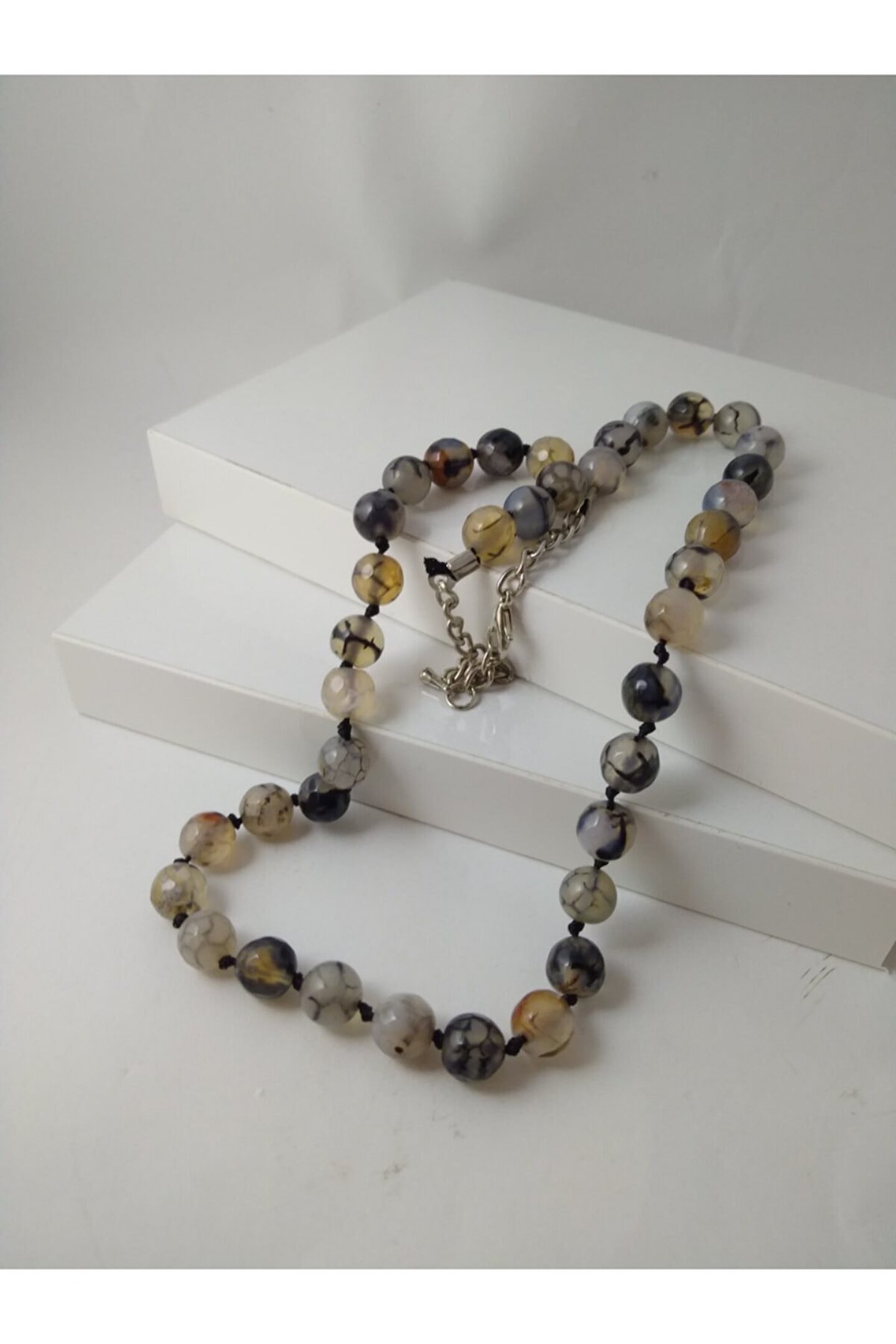 DOĞALTAŞ TASARIM KOLYE-SİYAHDAMARLI AKİK TAŞI DÜĞÜMLÜ KOLYE Özel olarak tasarlanan düğüm ileyapılan doğaltaş kolyemiz sizlerin şıklığına şıklık katacak… *8mm siyah damarlı akik taşı ilemumlu ip kullanılarak tasarlanmıştır. ; (Kolye sarkma yapmamaktadır.) Her taşarasında düğüm bulunmaktadır. ; *Kolyede toplam 38 adet doğaltaşbulunmaktadır. ; *Kolye uzunluğu 40-45 cmolmaktadır. ; İster kendinizin ister sevdiklerinizin zarafetinize eşlik etmek üzere sizleri bekliyor. ; Parfüm, Alkol v.b. ; gibiMaddeler ile Temasından Kaçınılmalıdır.;