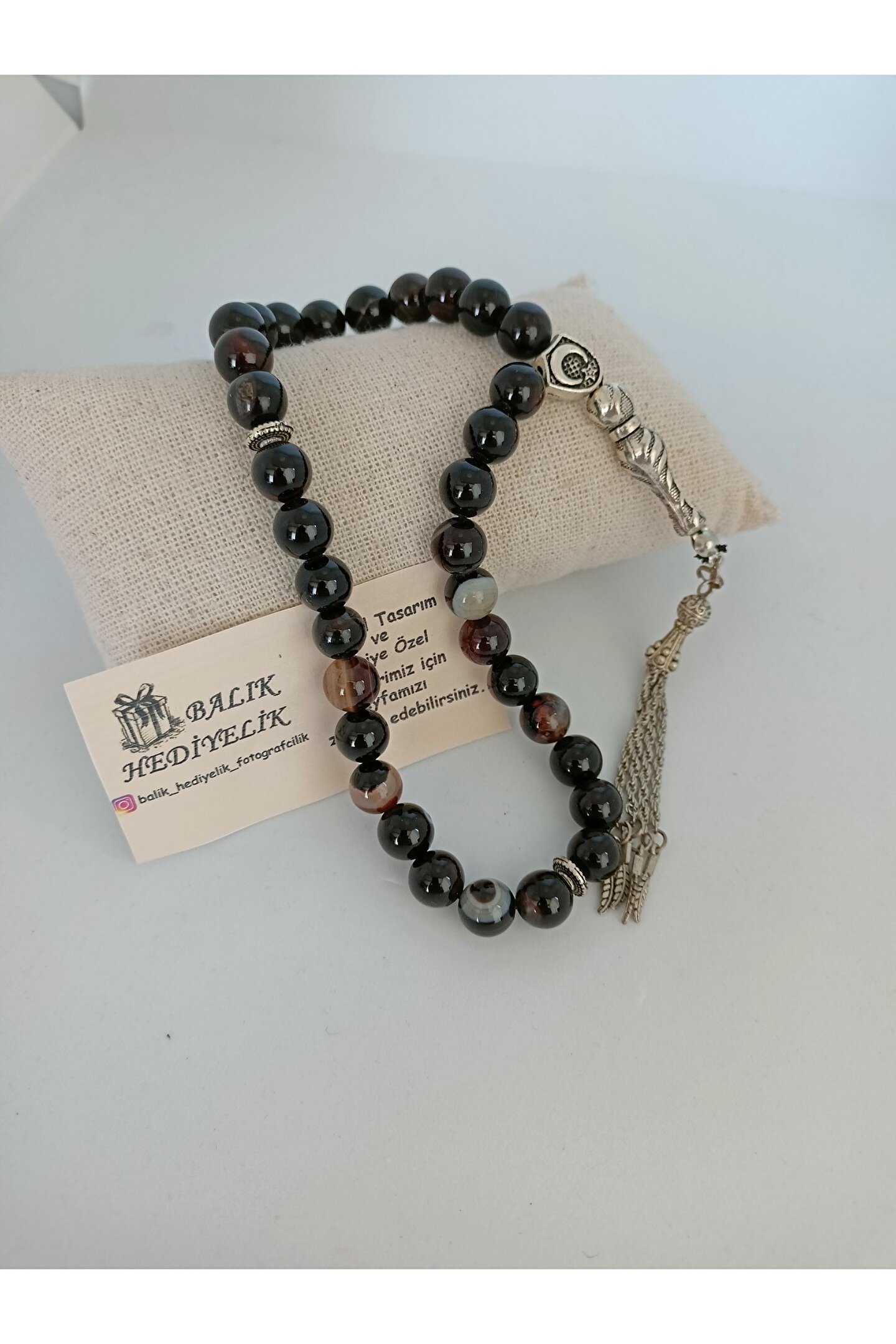 SİYAH AKİK TAŞITESPİH Ahşap Kutulu / 10 mm DOĞALTAŞ TESPİH-1021 AKİK TAŞI (Stres Taşı): Akik taşının en bilinen faydası kişiyi ruhsal açıdankorumasıdır. Güçlü bir enerjisi olan butaş gerginliği ve stresi azaltarak kişinin uyumsuzluklarını en aza indirir. Hamilelikte anneve bebek sağlığı için faydalıdır. Aynı zamanda dünyevibaşarıya yardımcı olarak kişiyi yorgunluktan ve tükenmiş hissetme duygusundanuzaklaştırır. Bunun yanı sıra ağrıları azalttığı, cilde ve kemiklere iyigeldiğine inanılmaktadır. Şifası ve kişiye hissettirdiği maneviyat nedeniyleoldukça tercih edilmektedir. Ürünün Özellikleri; Ürünlerimiz gerçek doğaltaş ile hazırlanmıştır. Mumlu ipe dizili olup, sarkma veya kopma yapmaz. Tespihtane boyutu 10 mm ve küre kesimdir. Doğaltaş tespih 33’lü olup, istediğiniz püskül modelini tercih edebilirsiniz . Sadece bize bildirmeniz yeterli. Ürün size görselde gördüğünüz ahşap hediye kutusu içerisinde gönderilecektir.