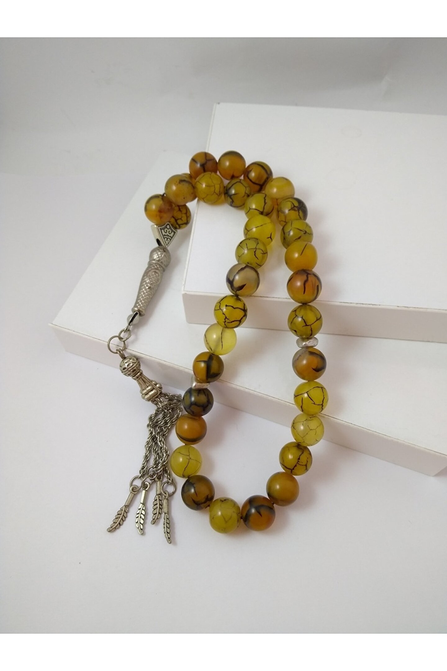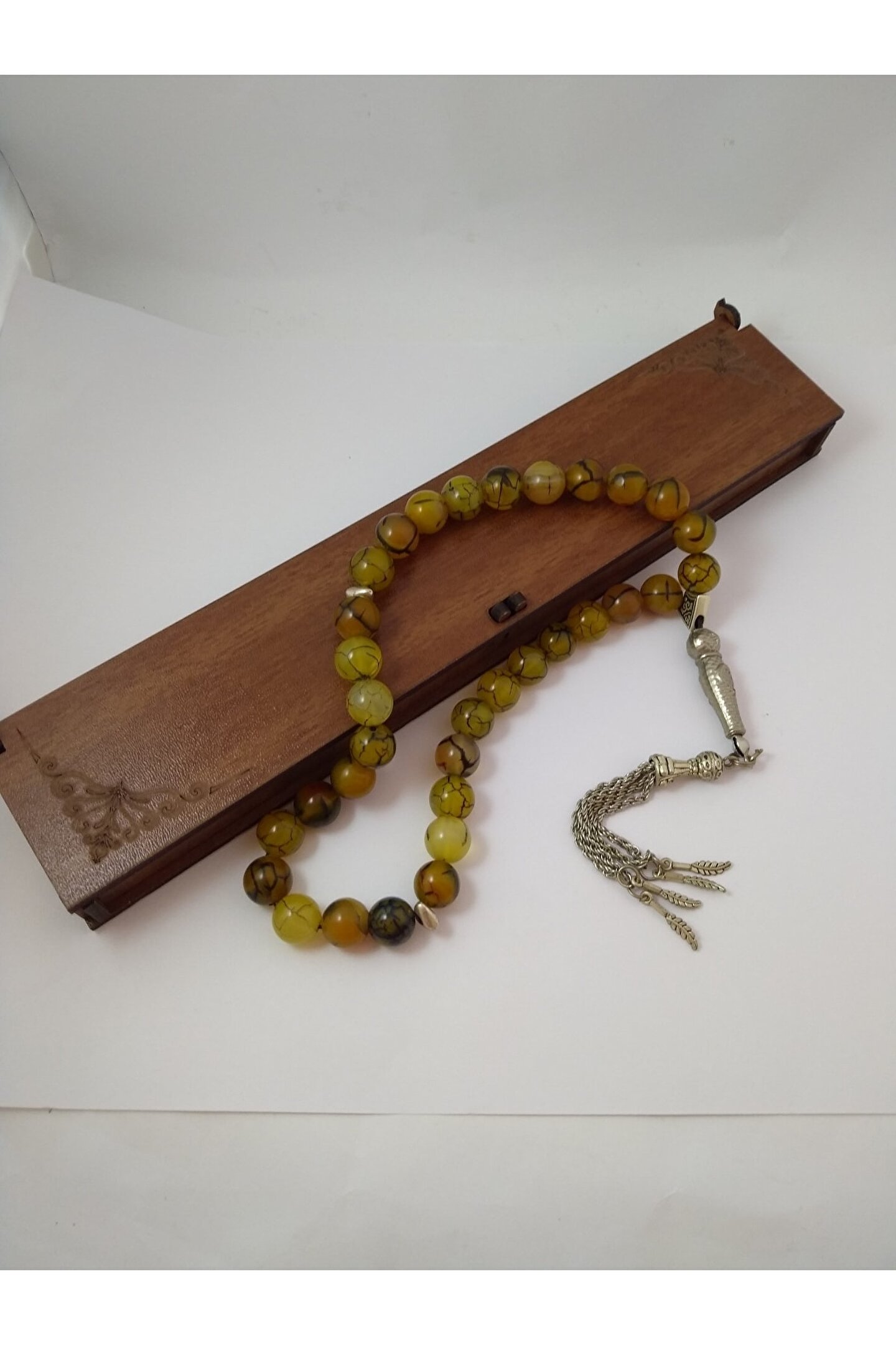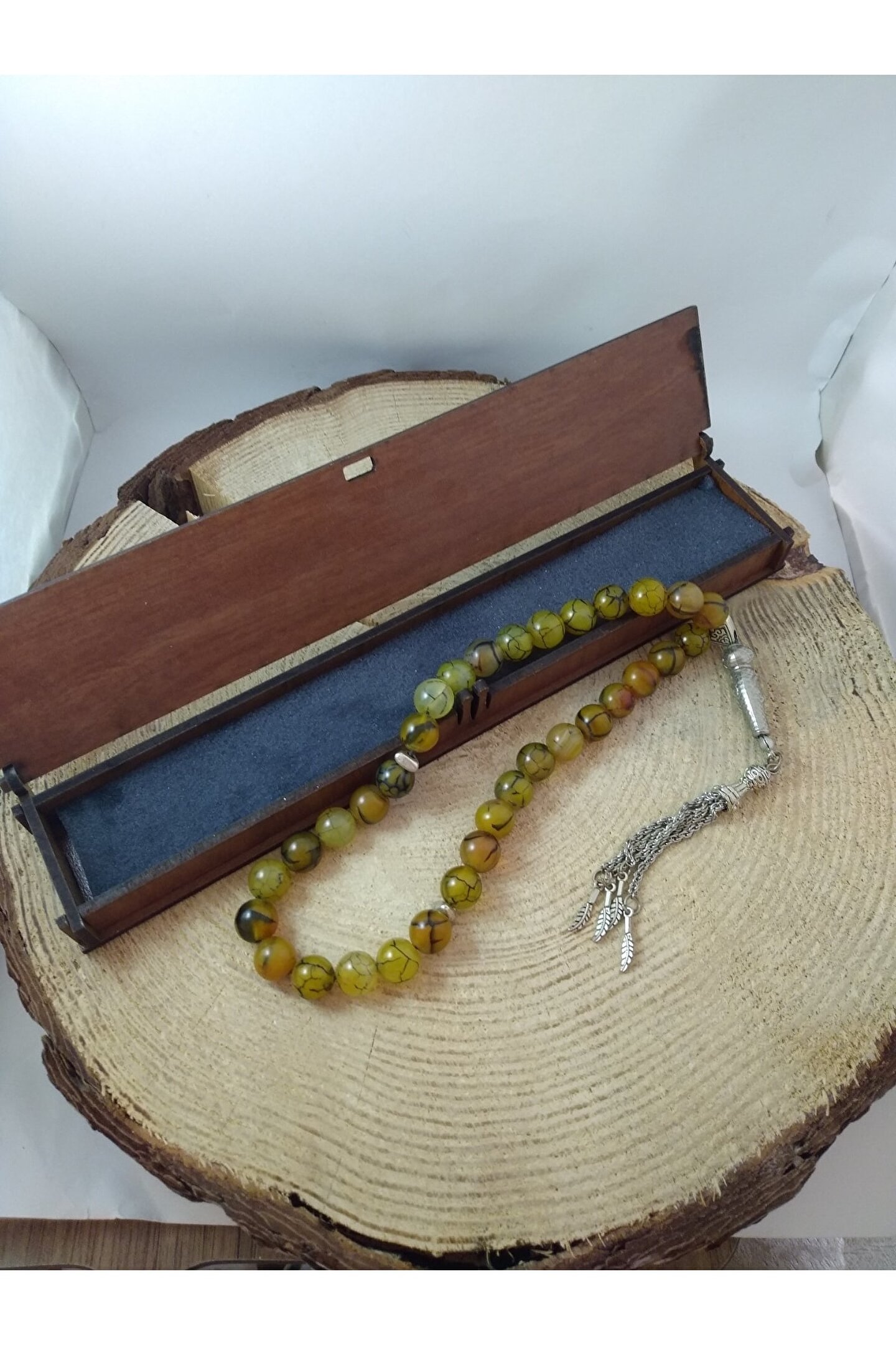 YEŞİL DAMARLI AKİKTAŞI TESPİH Ahşap Kutulu / 10 mm DOĞALTAŞ TESPİH AKİK TAŞI (Stres Taşı): Akik taşının en bilinen faydası kişiyi ruhsal açıdankorumasıdır. Güçlü bir enerjisi olan butaş gerginliği ve stresi azaltarak kişinin uyumsuzluklarını en aza indirir. Hamilelikte anneve bebek sağlığı için faydalıdır. Aynı zamanda dünyevibaşarıya yardımcı olarak kişiyi yorgunluktan ve tükenmiş hissetme duygusundanuzaklaştırır. Bunun yanı sıra ağrıları azalttığı, cilde ve kemiklere iyigeldiğine inanılmaktadır. Şifası ve kişiye hissettirdiği maneviyat nedeniyleoldukça tercih edilmektedir. Ürünün Özellikleri; Ürünlerimiz gerçek doğaltaş ile hazırlanmıştır. Mumlu ipe dizili olup, sarkma veya kopma yapmaz. Tespihtane boyutu 10 mm ve faset kesimdir. Doğaltaş tespih 33’lü olup, istediğiniz püskül modelini tercih edebilirsiniz . Sadece bize bildirmeniz yeterli. Ürün size görselde gördüğünüz lazerkesim ahşap hediye kutusu içerisinde gönderilecektir.