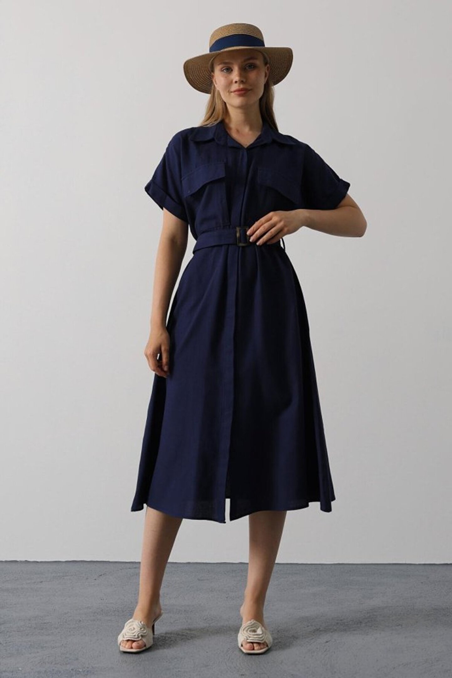 Barış Beauty Gökyüzü Moda Kuşaklı Cep Detaylı Yarım Kol Elbise - Lacivert