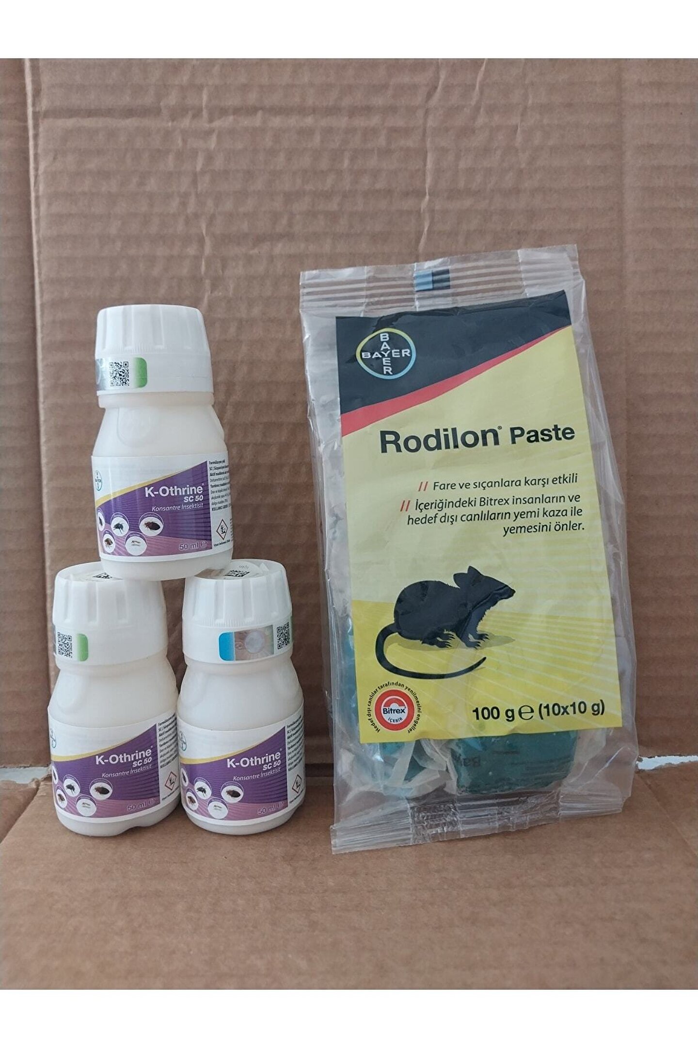 K-Othrine sc50 haşere ılacı 50 ml bayer k-Othrine sc 50 genel haşere ilacı 50 ml k-Othrine sc 50 profesyonel ilaçlama firmalarının kullandığı haşere ilacı 50 ml ambalajda üretici firma : Bayer etken madde : Deltamethrine 50g/l (saf) özellikler: Su ile seyrelterek hazırlanan konsantre üründür. Ambalaj şekli 50 ml kullanımı her 10 ml 1 litre su ile inceltilerek sprey veya pompa yardımı ile yüzeylere sıkılır. Haşerelerin görüldüğü yerlere, kapı ve duvar kenarlarına, zemin ve parke içlerine püskürtülür. Etkinin artması için 10 gün ıslak temizlik yapılmamalıdır. Yüksek etkili delthamethrin aktif maddesi ile hızlı düşürücü (knockdown) ve güçlü öldürücü (killing) özelliği yanında "flush-Out" özelliği ilede haşereleri saklandıkları yerlerden çıkararak kısa sürede etkili kontrol sağlar. Formülasyonu uygulama yapılan yüzey tarafından emilmez ve diğer sıvı formülasyonlara göre daha uzun süre kalıcılık sağlar. Su bazlıdır,yüzeylere zarar veren solvent ve yağlar içermez. Çevre kirliliğine neden olmaz (biodegradable) düşük uygulama dozu ile ekonomiktir. Etki süresi minimum 2 aydır. K-Othrine sc 50 whopes onaylıdır ve "who spesifikosyonu 333/sc (nisan 2005) " nolu who spesifikasyonuna sahiptir. Etkili olduğu türler hamamböceği, kalorifer böceği, gümüşçün, örümcek, karınca, akrep… ; Rodilon® Paste, fare ve sıçan gibi kemirgenlere karşı son derece etkili antikoagulant bir rodentisittir. Etkinliği en zor şartlarda bile (nemli ortamlarda da) kanıtlanmıştır. Pasta formülasyonu, farelere karşı son derece lezzetli yem içeriğine sahip bir formülasyondur. Uygun kullanım şekline sahiptir ve kullanıma hazır yem formülasyonludur. ;