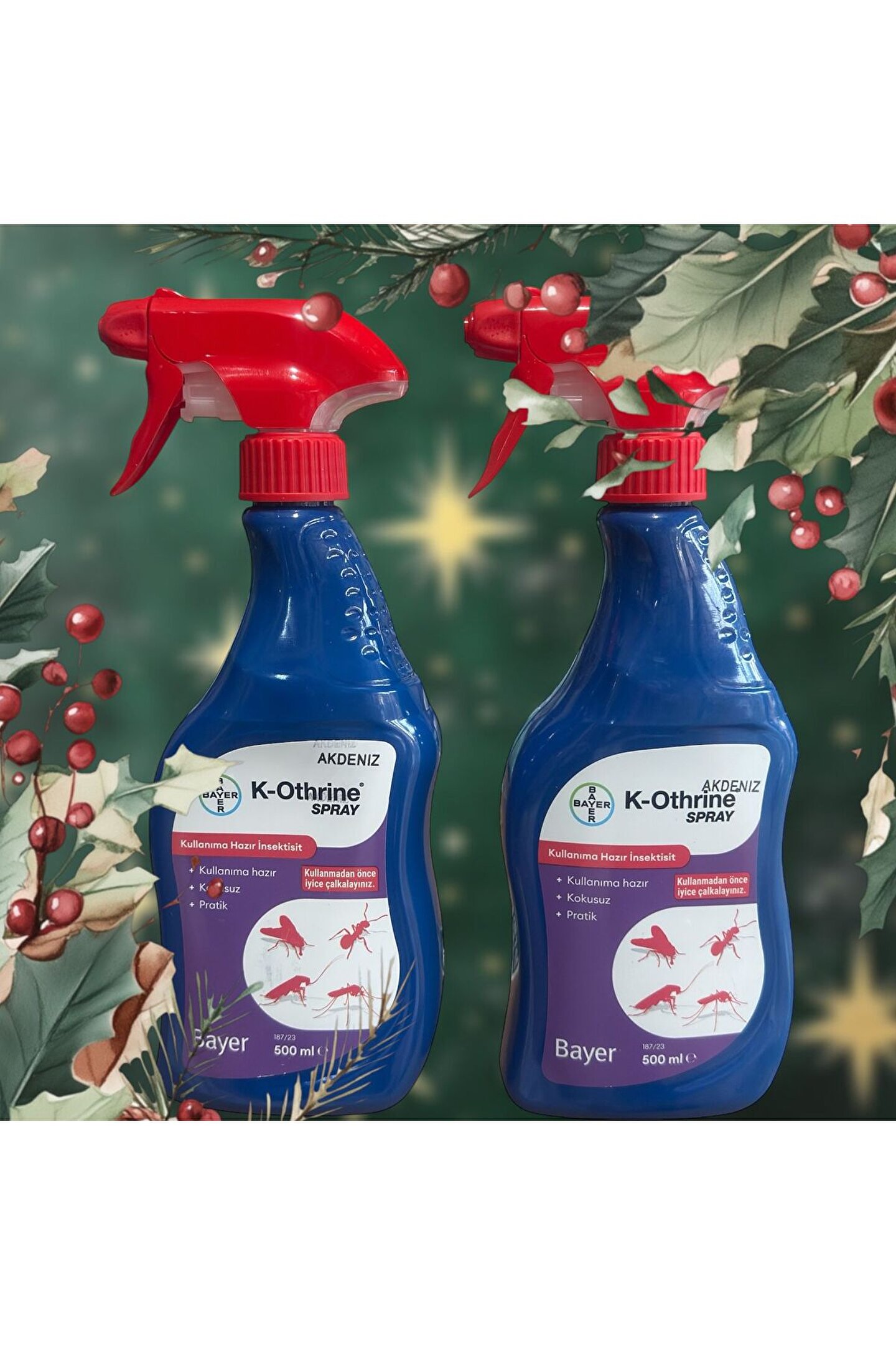 Pratik kullanım için tasarlanmış sprey formu, kolay ve hızlı uygulama imkanı sunar; 500 ml'lik ambalajı ile uzun süreli kullanım sağlar ve ekonomik bir seçenektir; İki adet sprey şişesi, birden fazla alanın aynı anda tedavi edilmesine olanak tanır; K; othrine sprey, ev ve iş yerlerinizde etkili haşere kontrolü için idealdir;