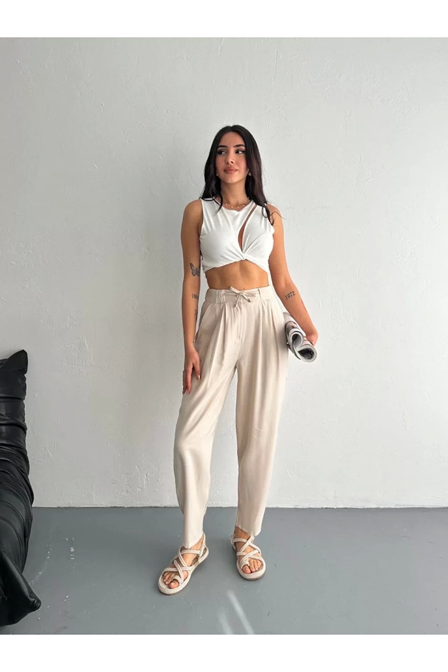 BBbutik Kadın Yüksel Bel Beli Bağcıklı Rahat Boru Paça Pantalon - Kırık Beyaz