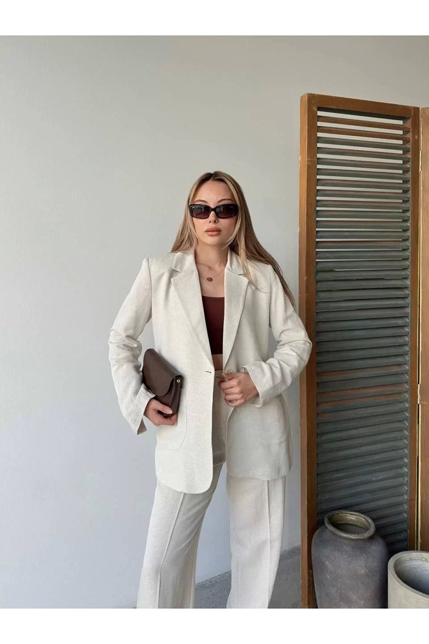 Keten Ceket Pantolon Ilik Düğmeli Uzun Kollu Yırtmaçlı Ikili Takım - Beyaz