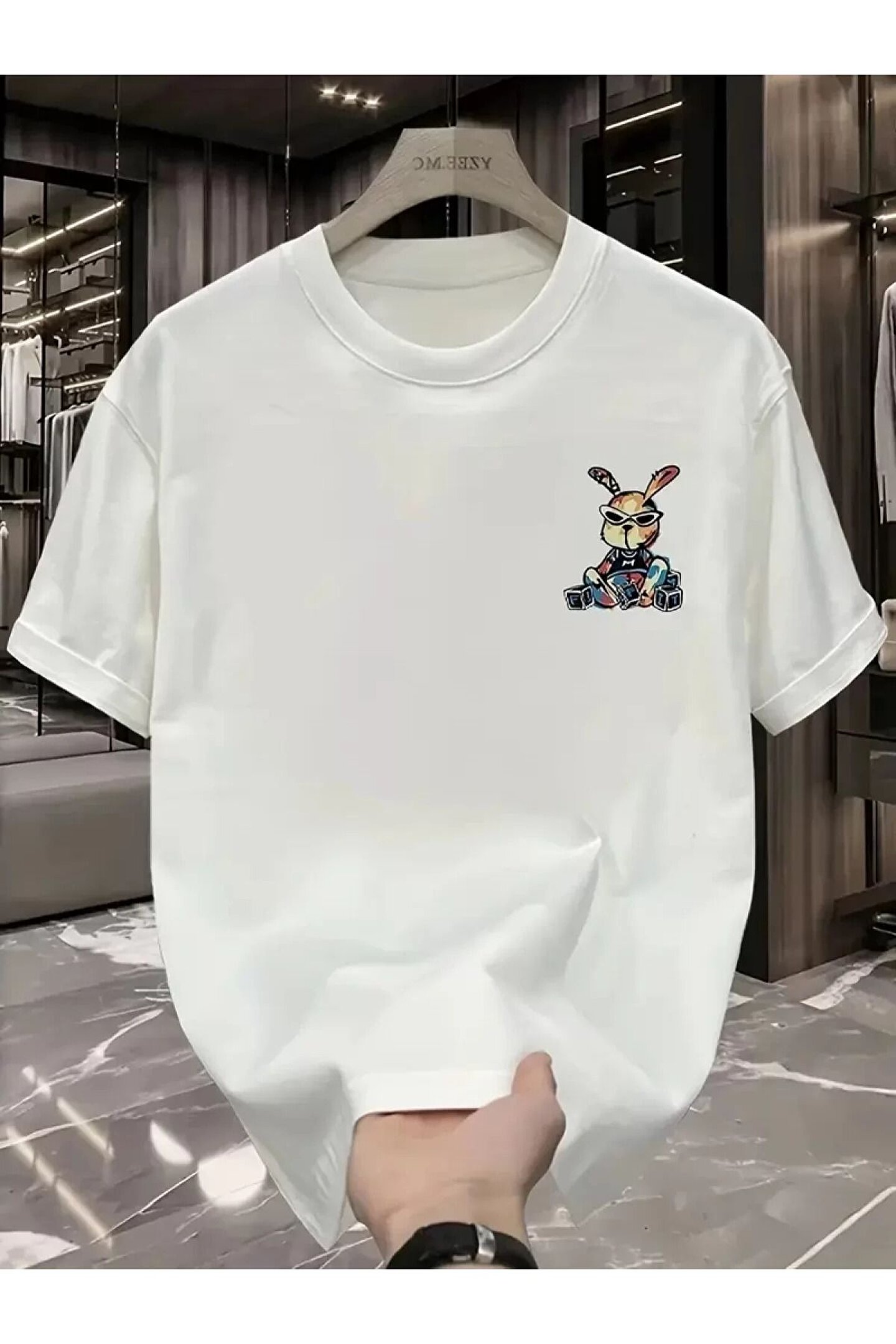 Güneş Gözlüğü Grafikli Karikatür Tavşan Oversize Kısa Kollu Tişört Çift Tişört, İlkbahar Ve Yaz - Beyaz