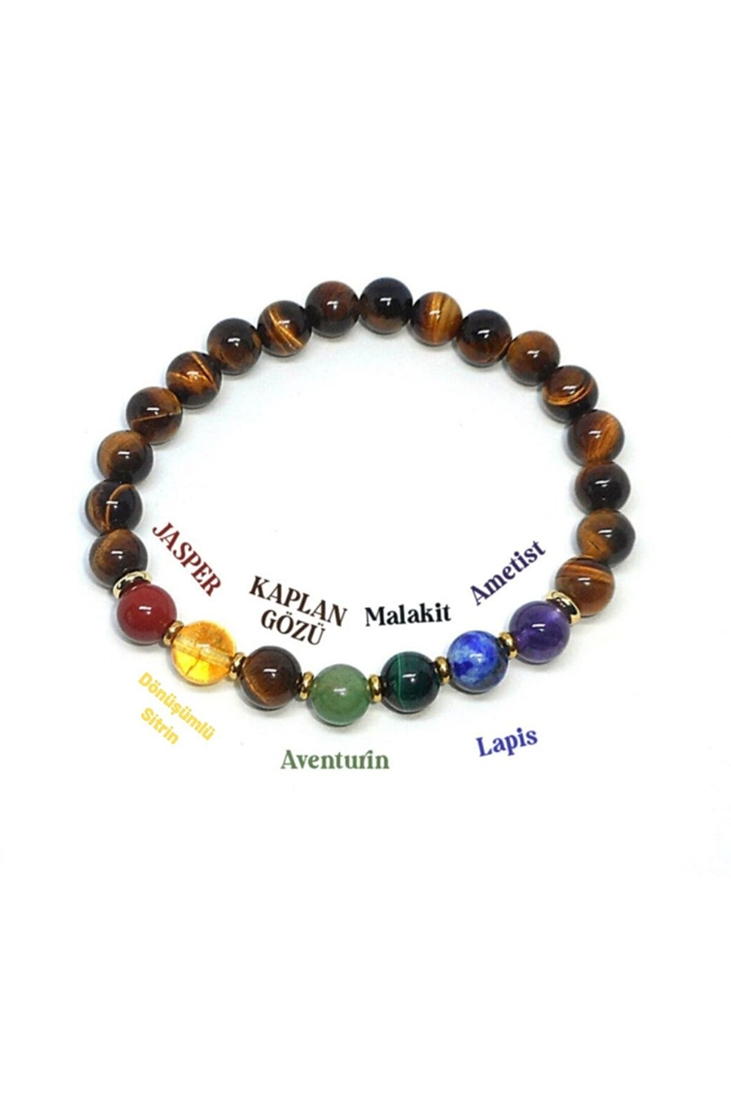 Bu şık bileklik, doğanın güzelliğini parmağınıza taşıyan bir mücevherdir; Jasper, sitrin, kaplan gözü, malahit, lapis ve ametist gibi doğal taşların eşsiz renkleri ile tasarlanmıştır; 8 mm boyutundaki taşlar, bileziğin zarif ve sofistike bir görünüm kazanmasını sağlar; Bu bileklik, hem günlük kullanım hem de özel günlerde şıklığınızı tamamlayacak ideal bir aksesuardır; Doğal taşların sıcaklığını parmaklarınızda hissedin ve doğanın enerjisini yanınızda taşıyın; ;;