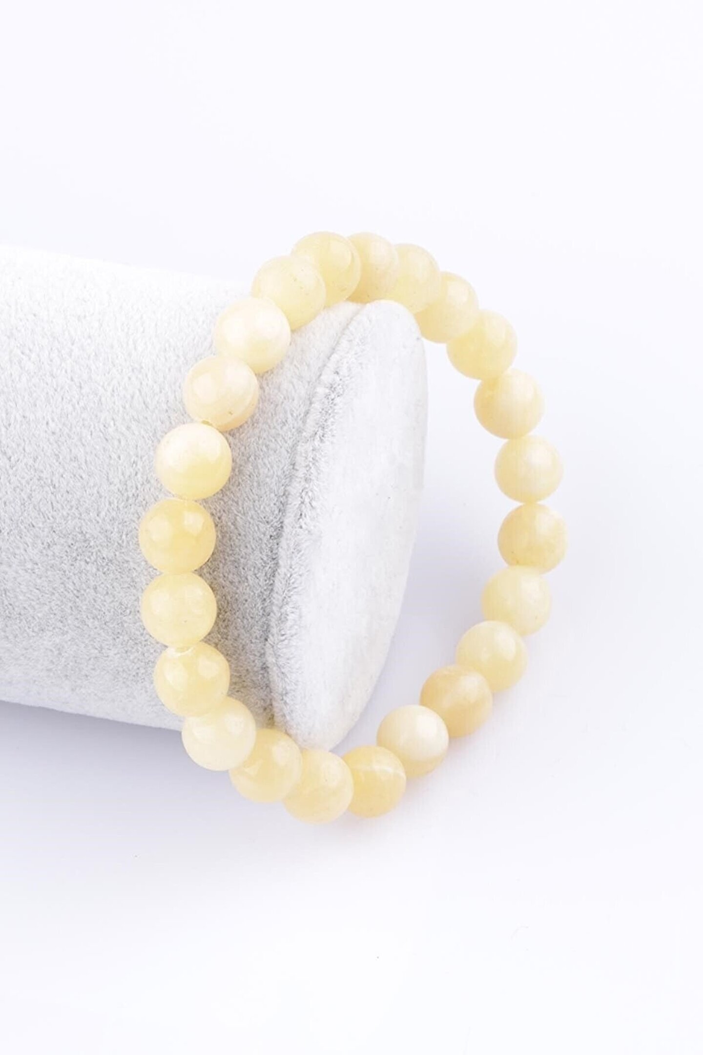 Doğal kalsit taşı kullanılarak üretilmiş, her bir bileklik benzersiz ve özgün bir tasarıma sahiptir;; 8 mm küre kesim doğal taş, zarif ve modern bir görünüm sunar;; Genç yaş grubuna hitap eden tasarımıyla, günlük kullanımda şıklığı ve rahatlığı bir arada sunar;; Doğal taş materyali sayesinde, bileklik hem dayanıklı hem de estetik bir aksesuar olma özelliği taşır;;