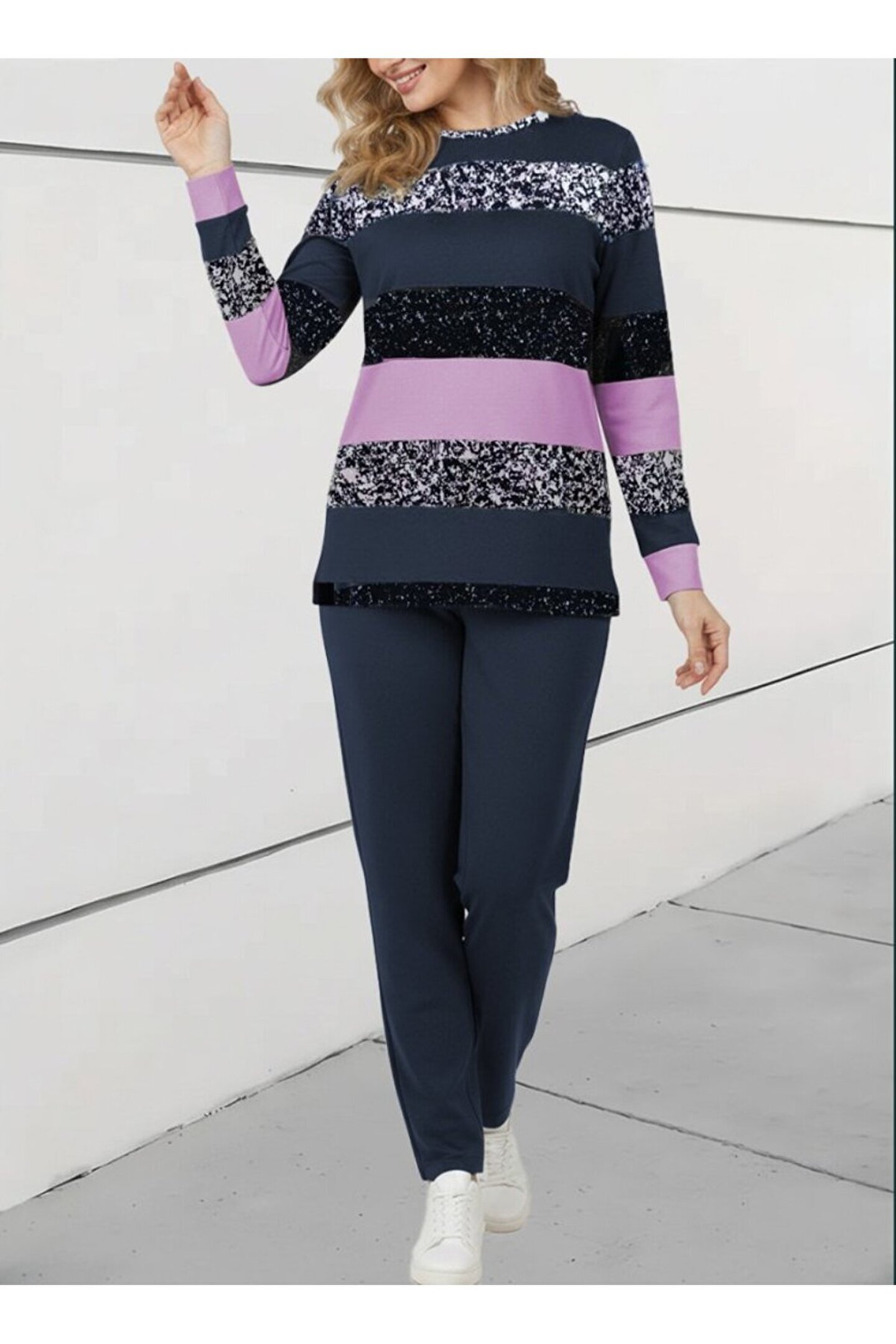 BEFAON eyesof Kadın Uzun Kollu Bisiklet Yaka çizgili Desen Iki Iplik Bluz Ve Pantolon Ikili Takım