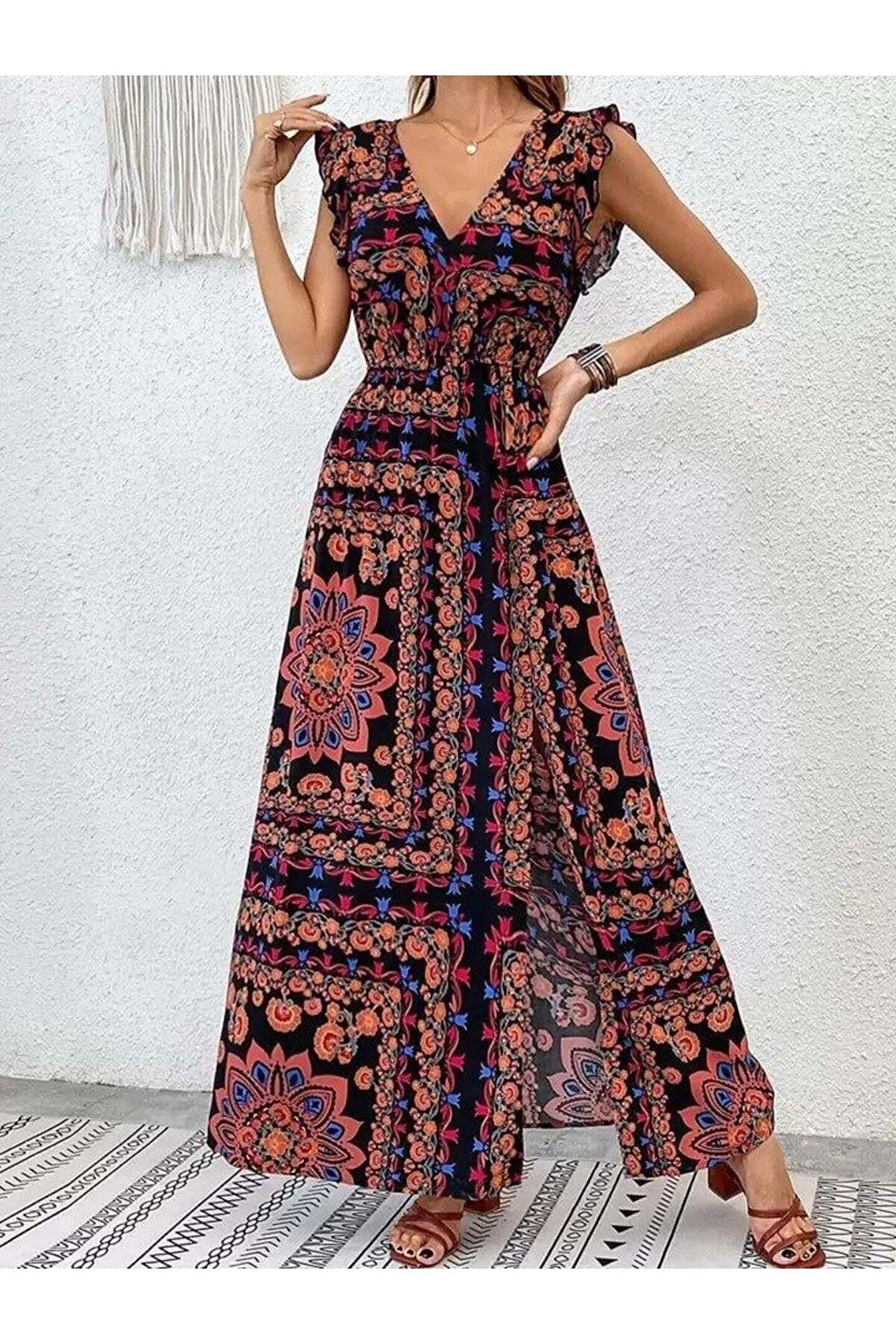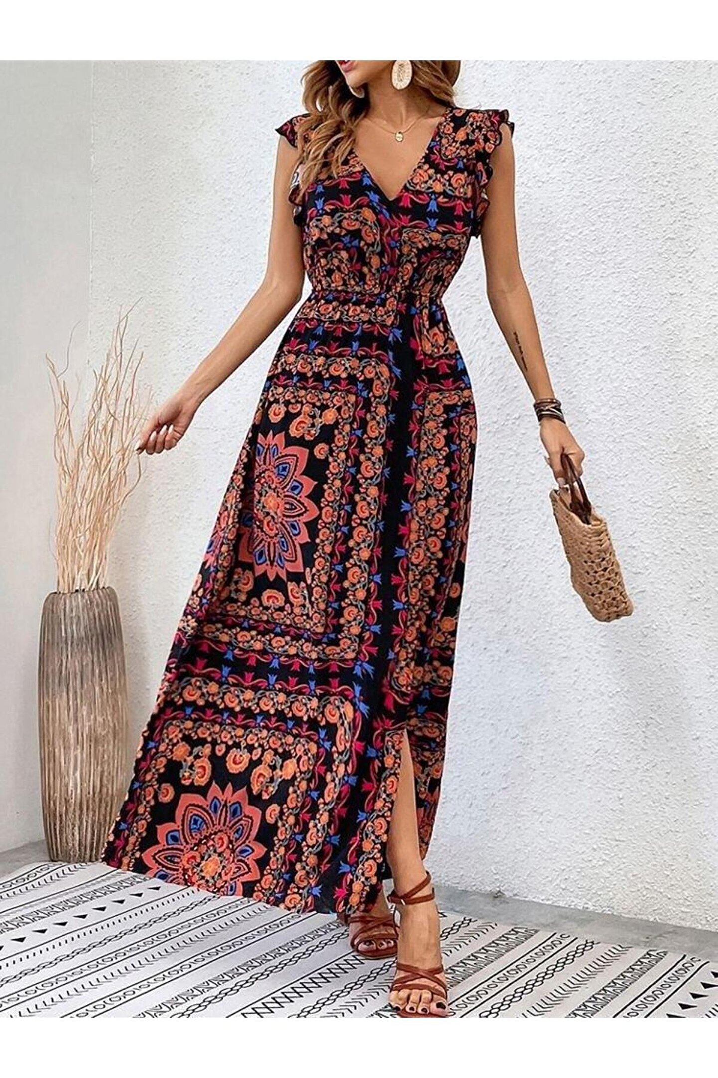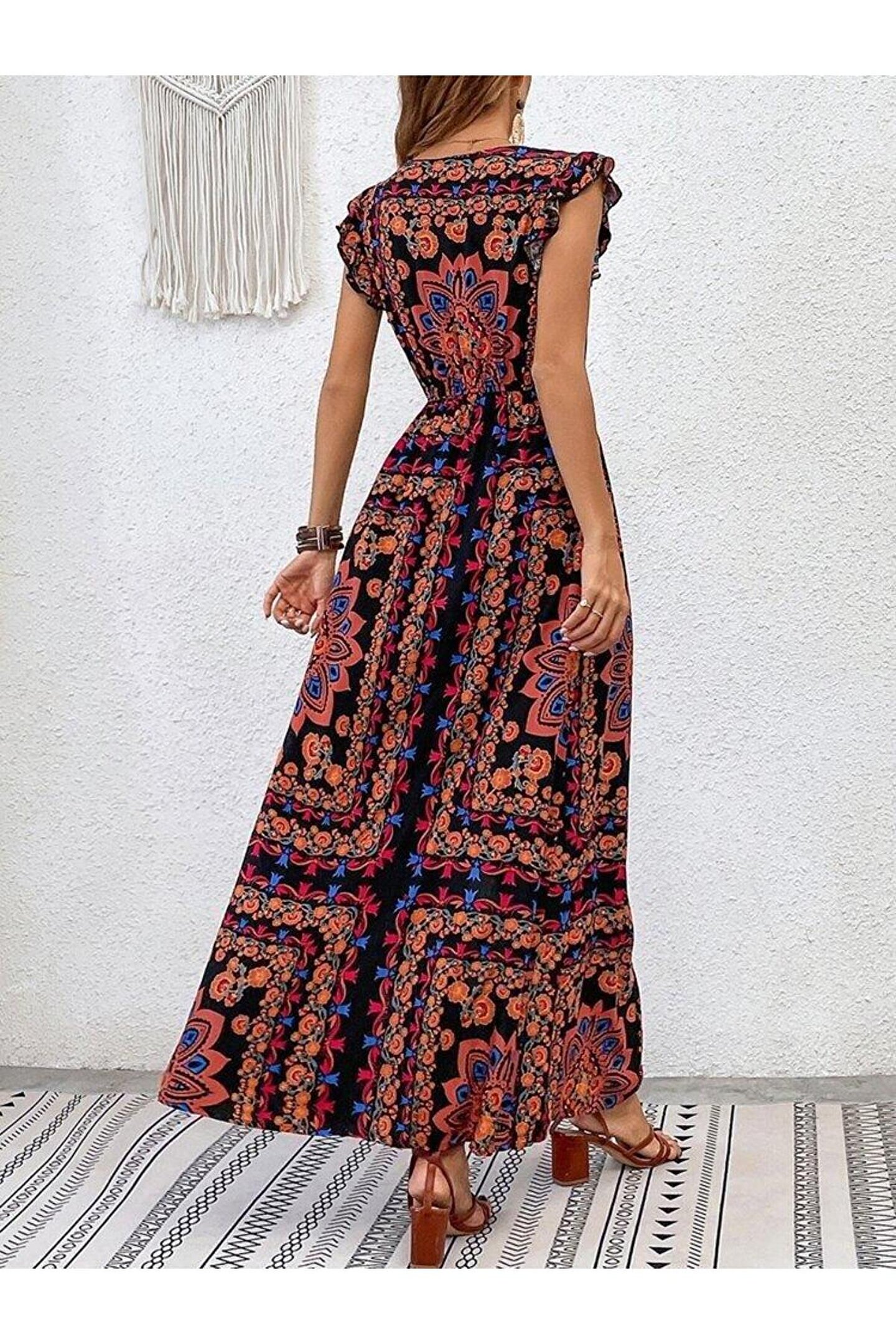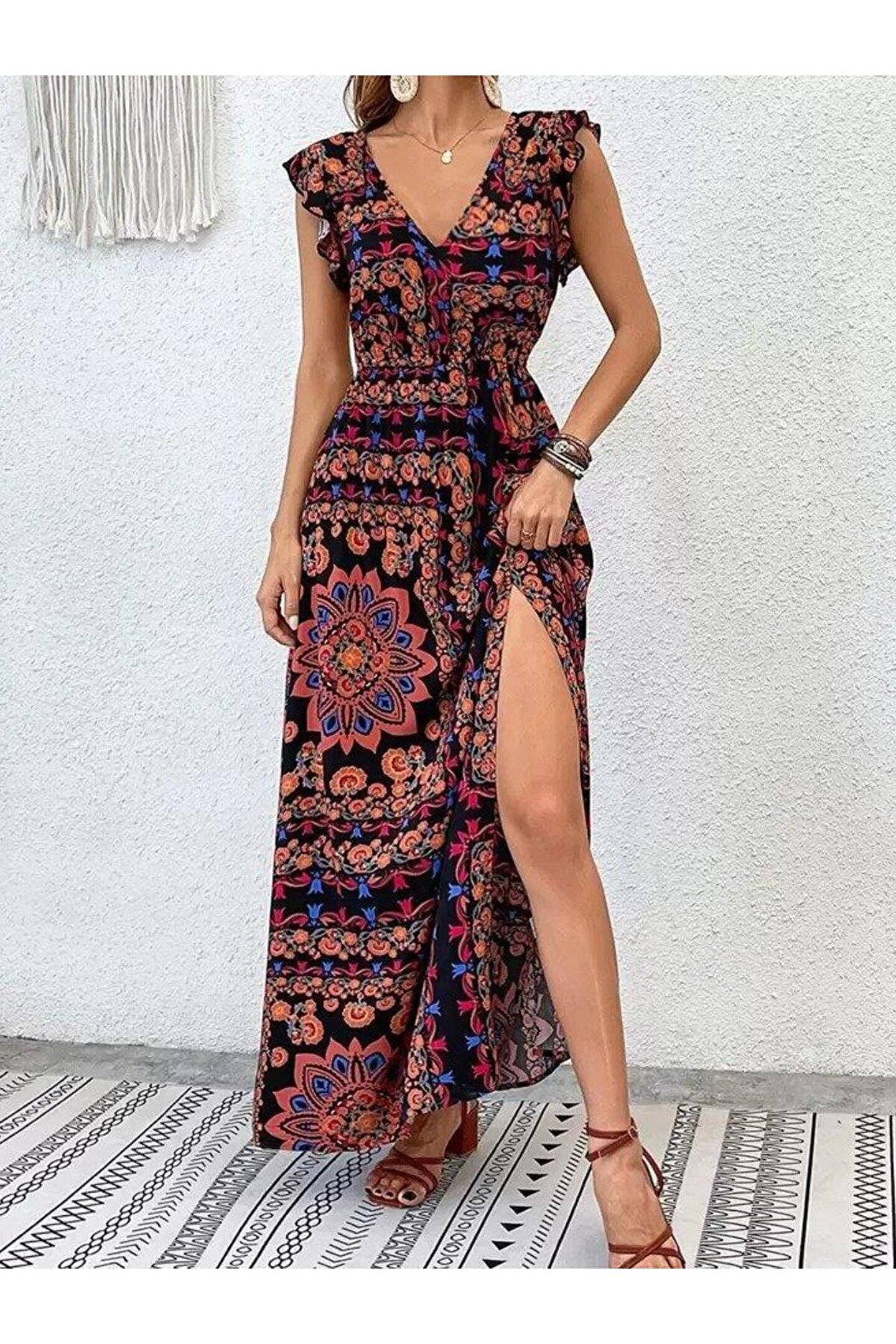 BEFAON Kadın Kısa Kollu V Yakalı Deseni Yırtmaçlı Süprem Elbise