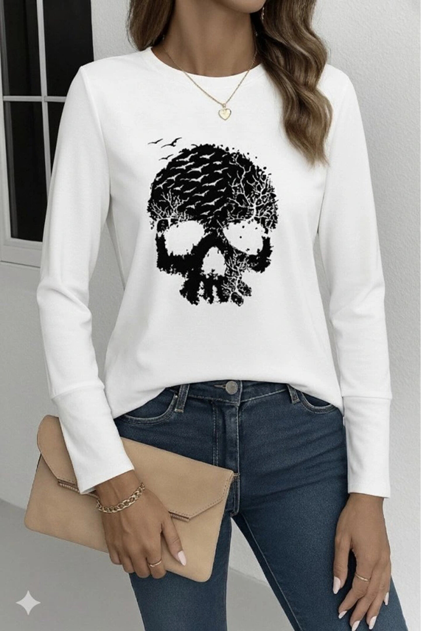 BEFAON Kadın Uzun Kollu Bisiklet Yaka Kurukafa Desenli Viskon Bluz