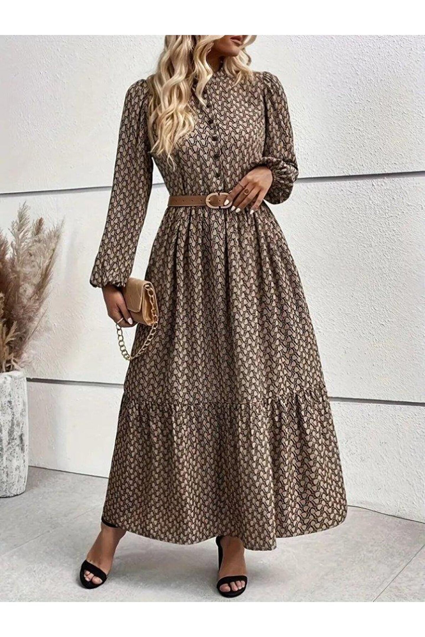BEFAON Kadın Uzun Kollu Hakim Yakalı Düğmeli Kemersiz Desenli Maxi Süprem Elbise