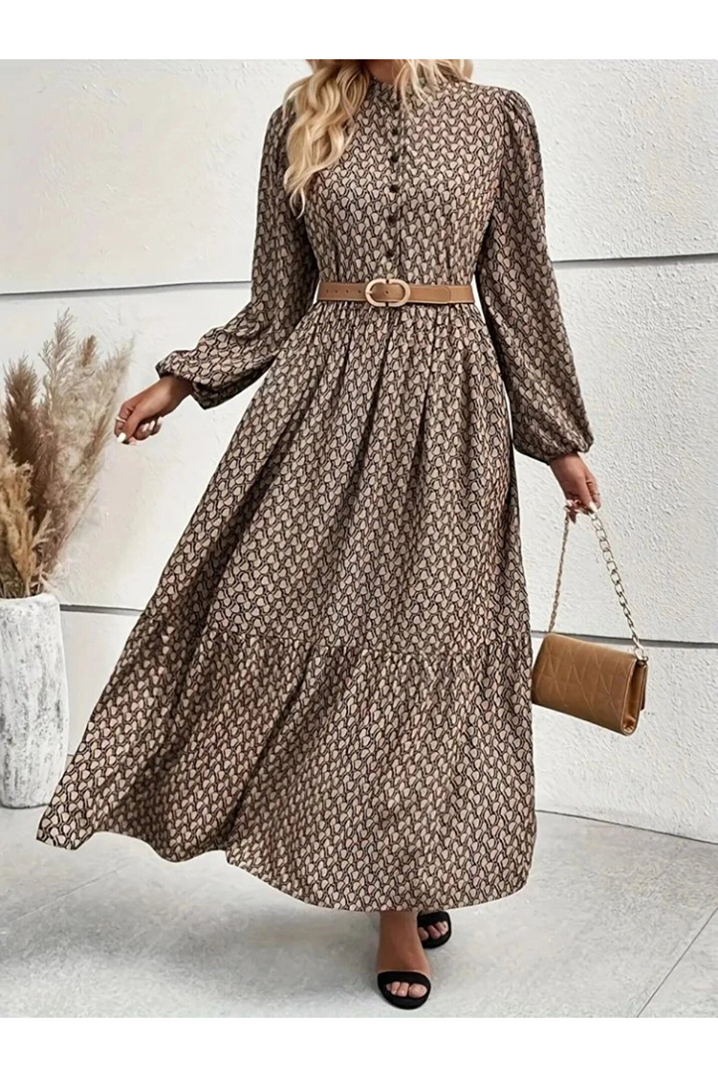 BEFAON Kadın Uzun Kollu Hakim Yakalı Düğmeli Kemersiz Desenli Maxi Süprem Elbise