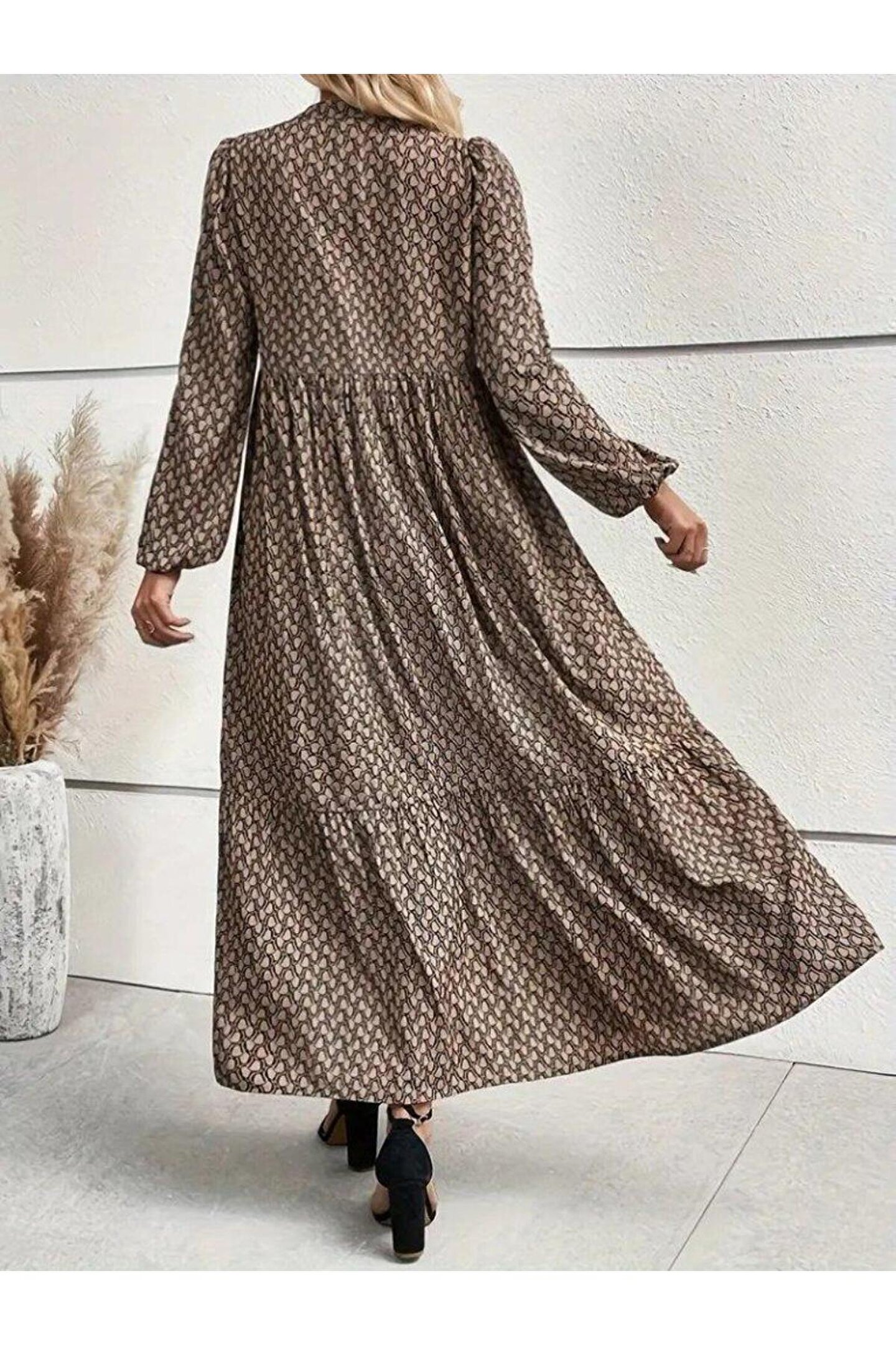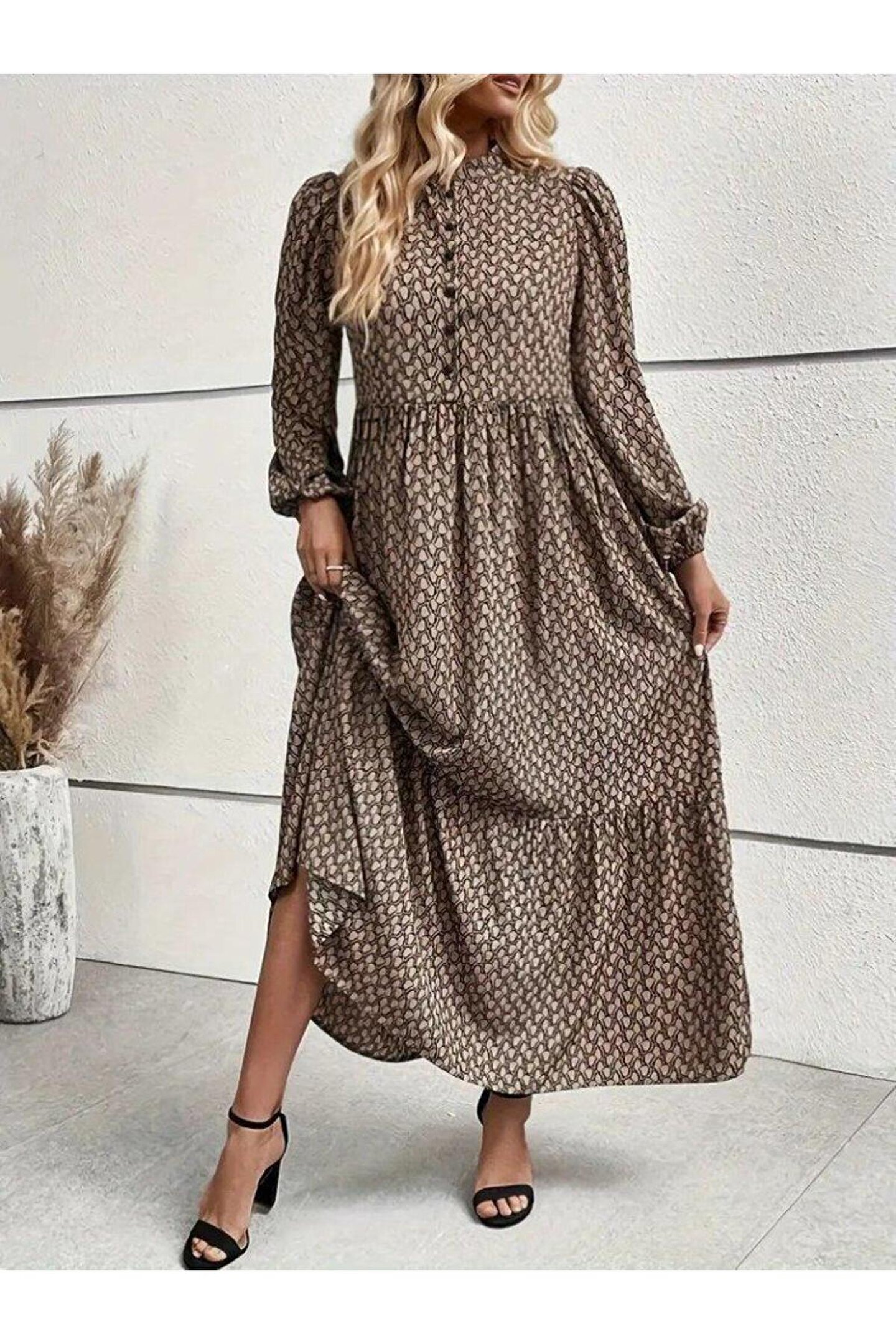 BEFAON Kadın Uzun Kollu Hakim Yakalı Düğmeli Kemersiz Desenli Maxi Süprem Elbise