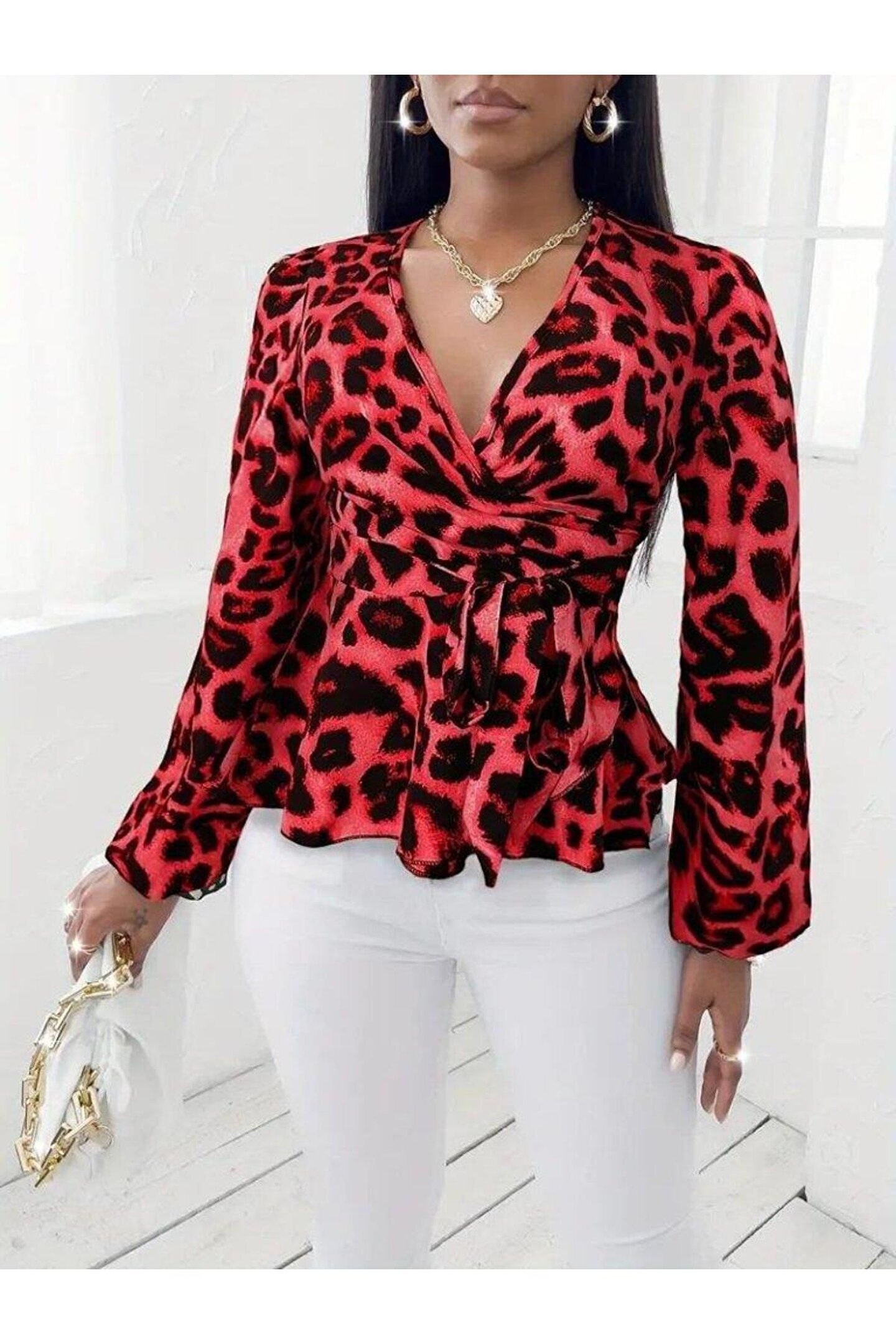 BEFAON Kadın Uzun Kollu Kruvaze Yakalı Belden Kuşaklı Leopar Desenli Süprem Bluz