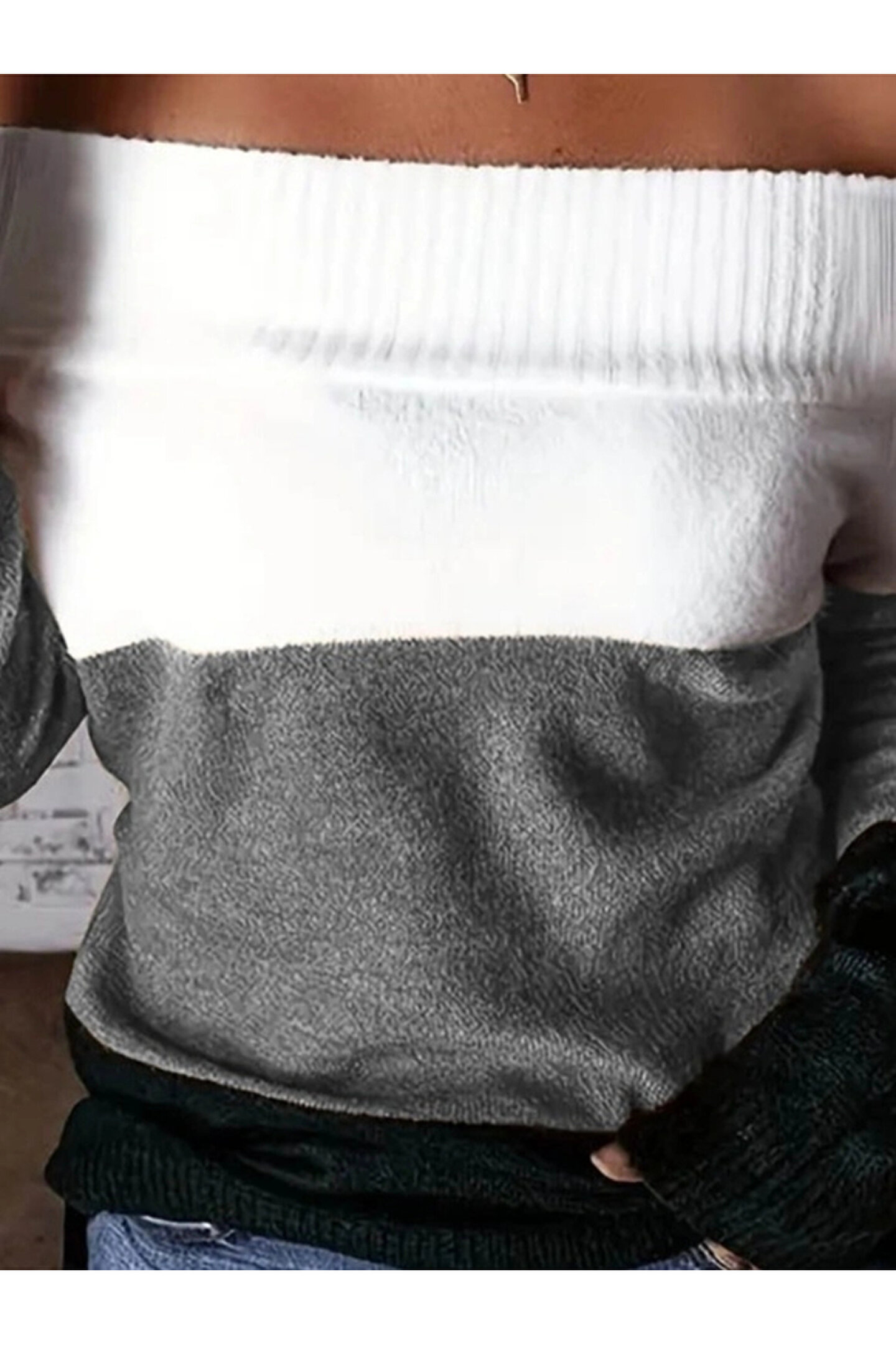 BEFAON Kadın Uzun Kollu Omuzlardan Açık Uzun Kollu Blok çizgili Triko Bluz