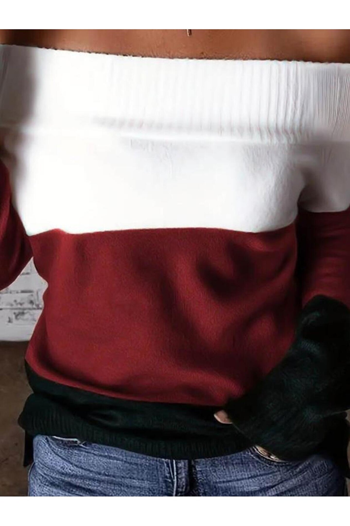 BEFAON Kadın Uzun Kollu Omuzlardan Açık Uzun Kollu Blok çizgili Triko Bluz