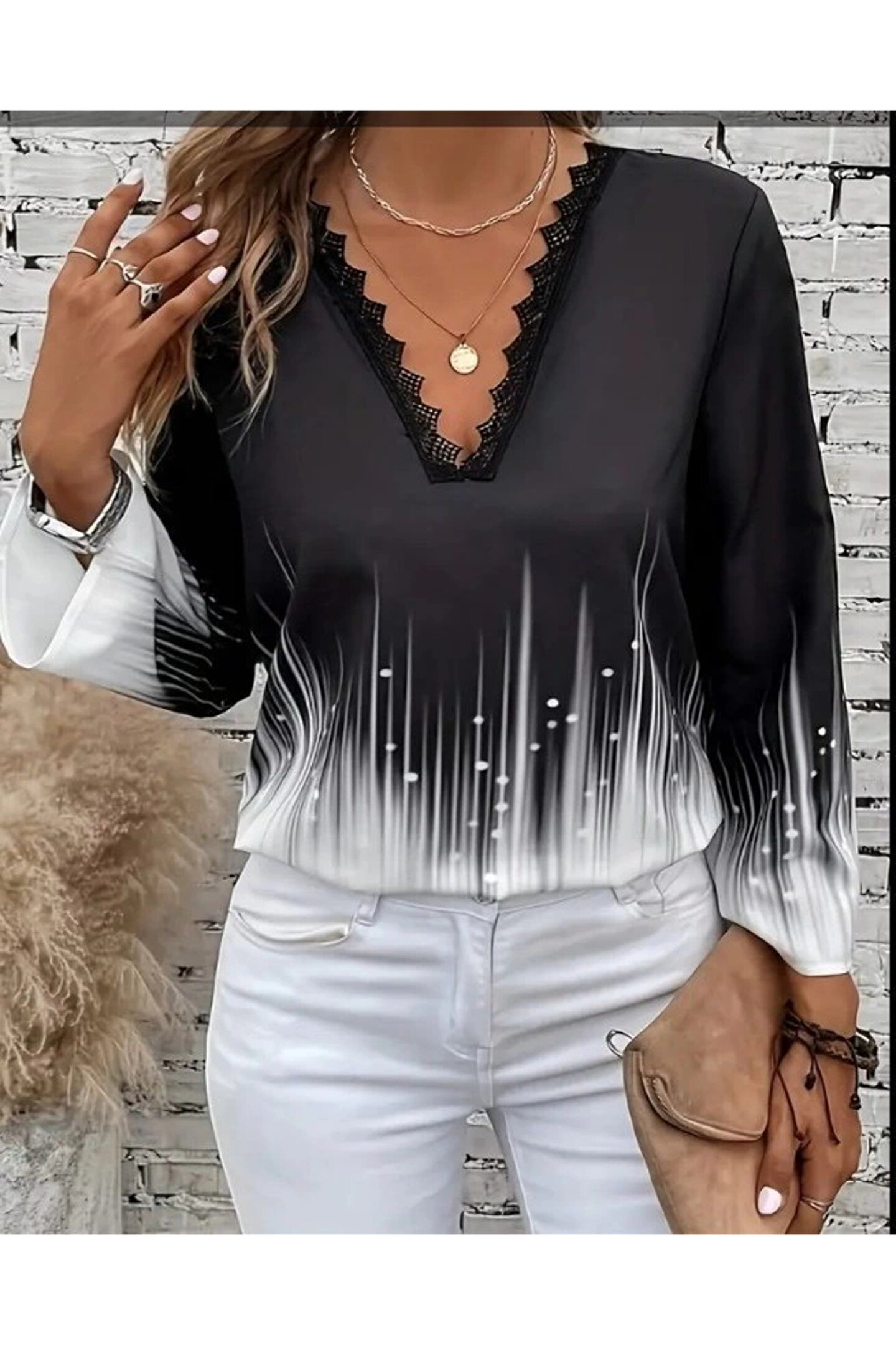 BEFAON Kadın Uzun Kollu V Dantel Yaka Desenli Modal Bluz