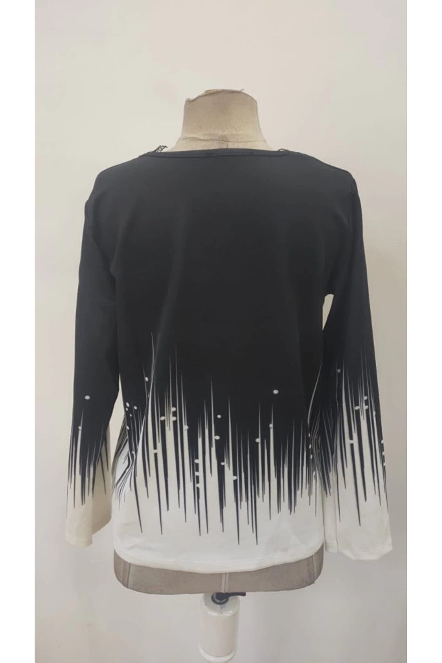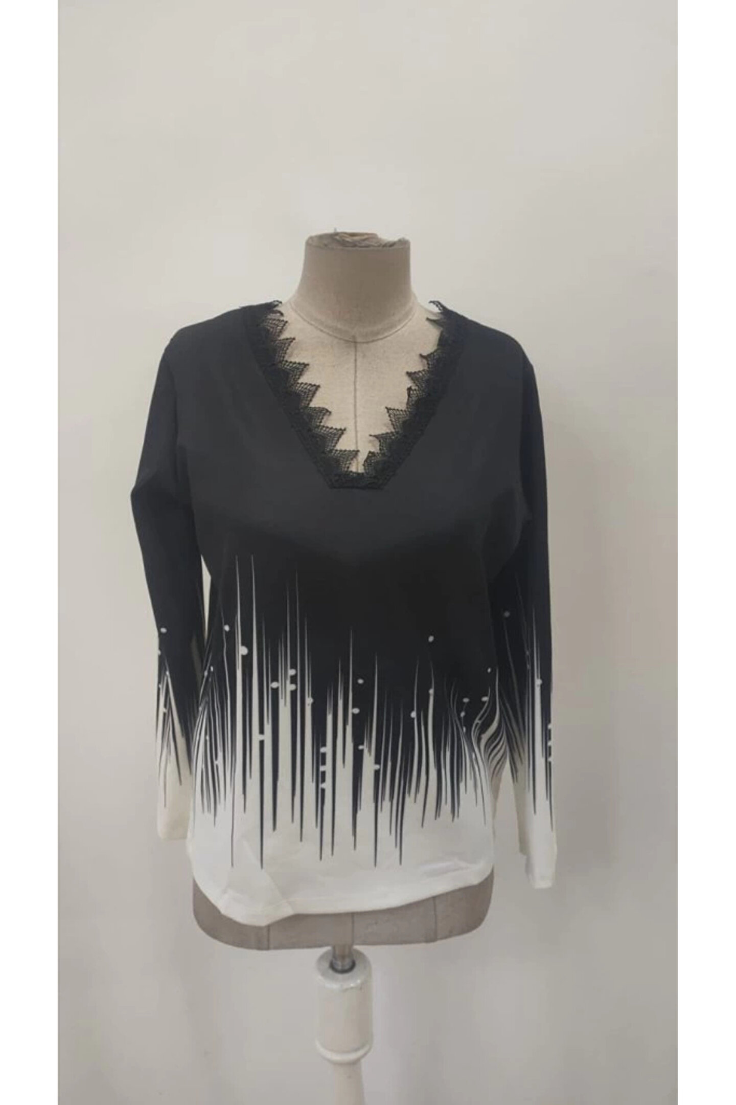 Kadın Uzun Kollu V Dantel Yaka Desenli Modal Bluz