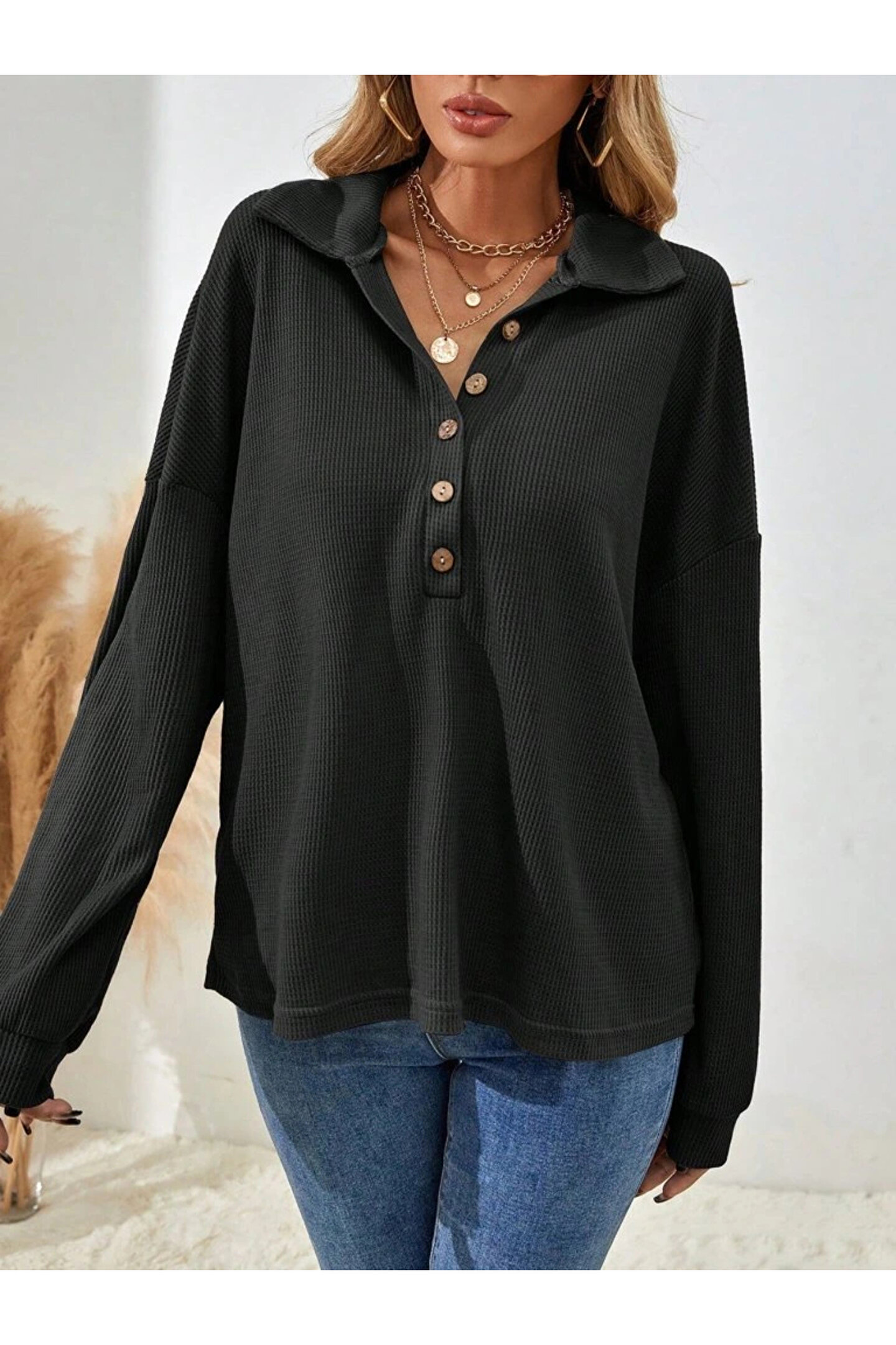 Kadın Uzun Kollu Yakalı Düğmeli Salaş Waffle Bluz