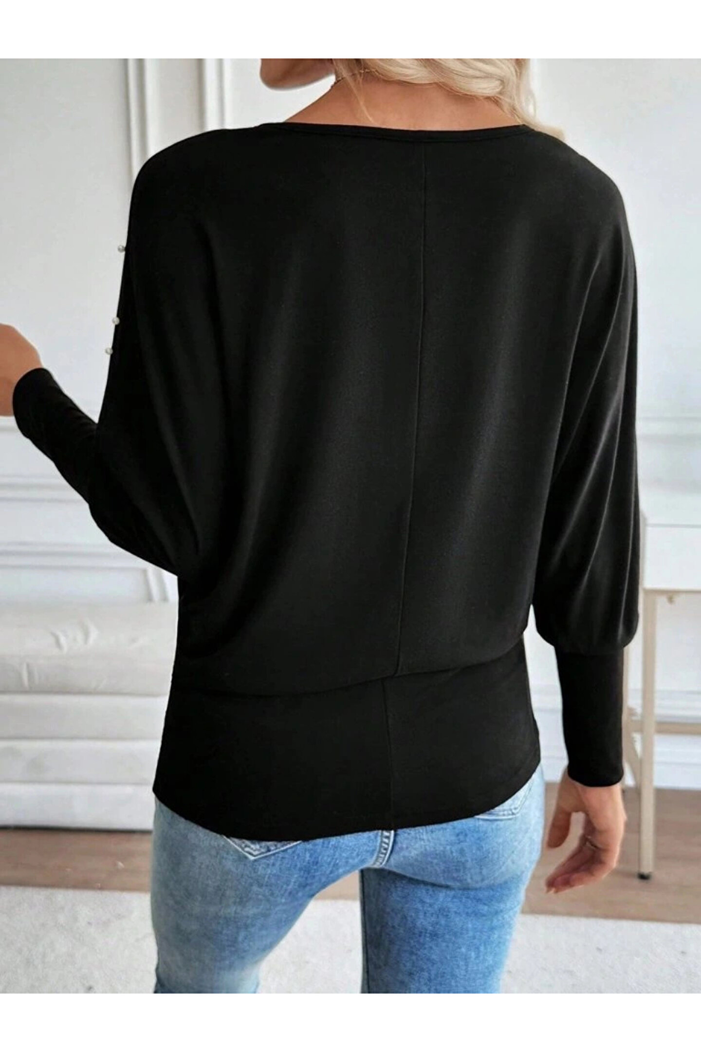 Kadın Uzun Kollu Yuvarlak Yaka Incili Viskon Bluz