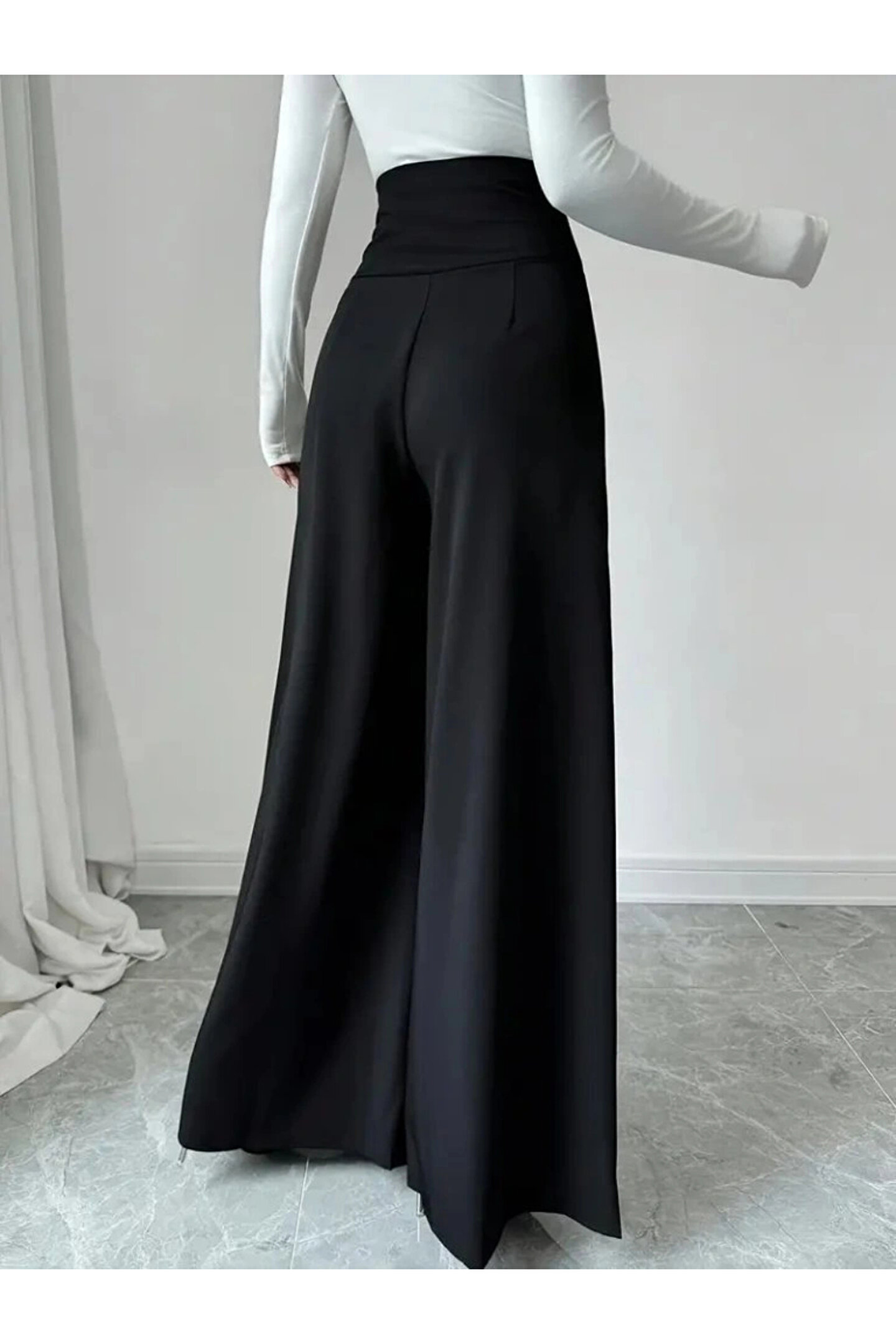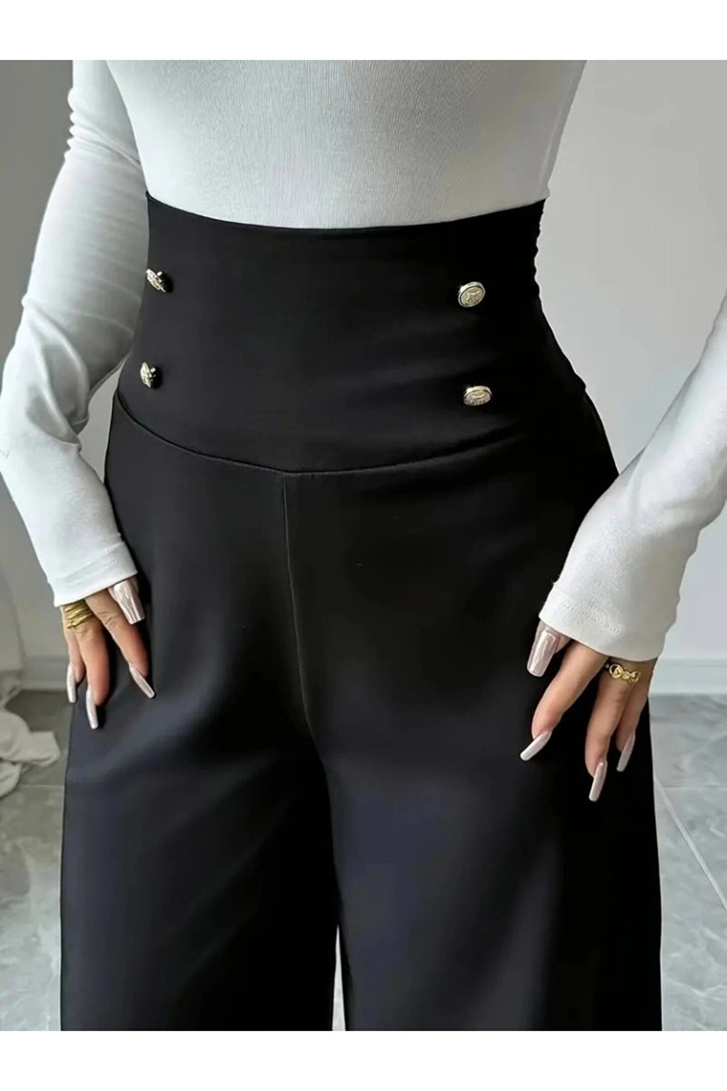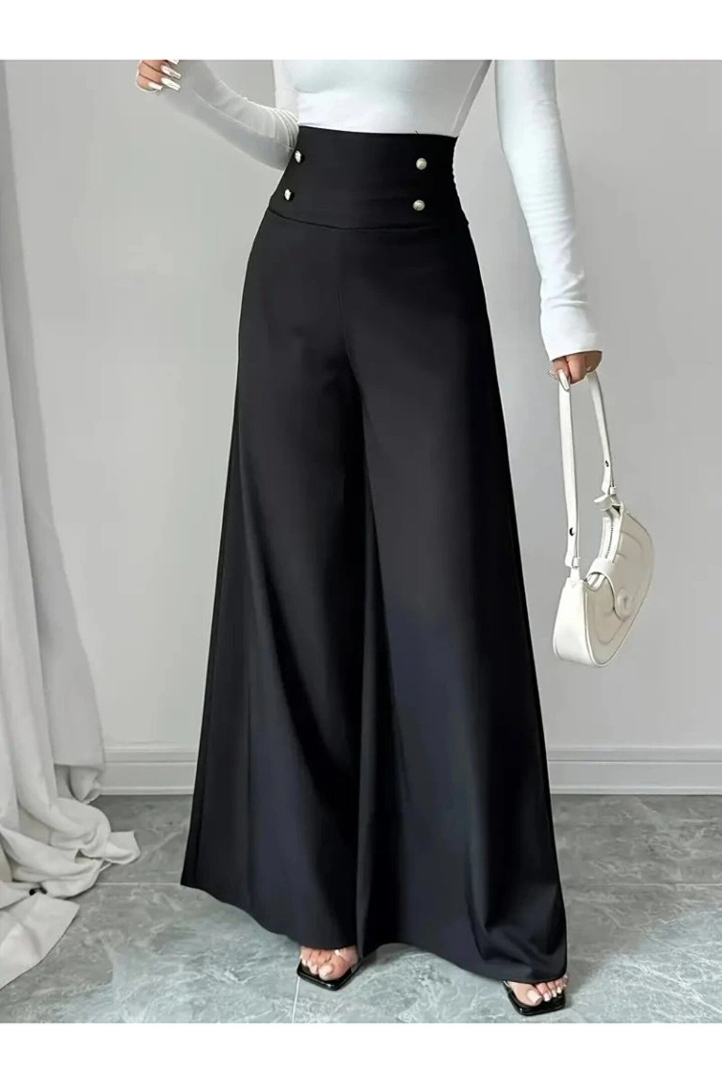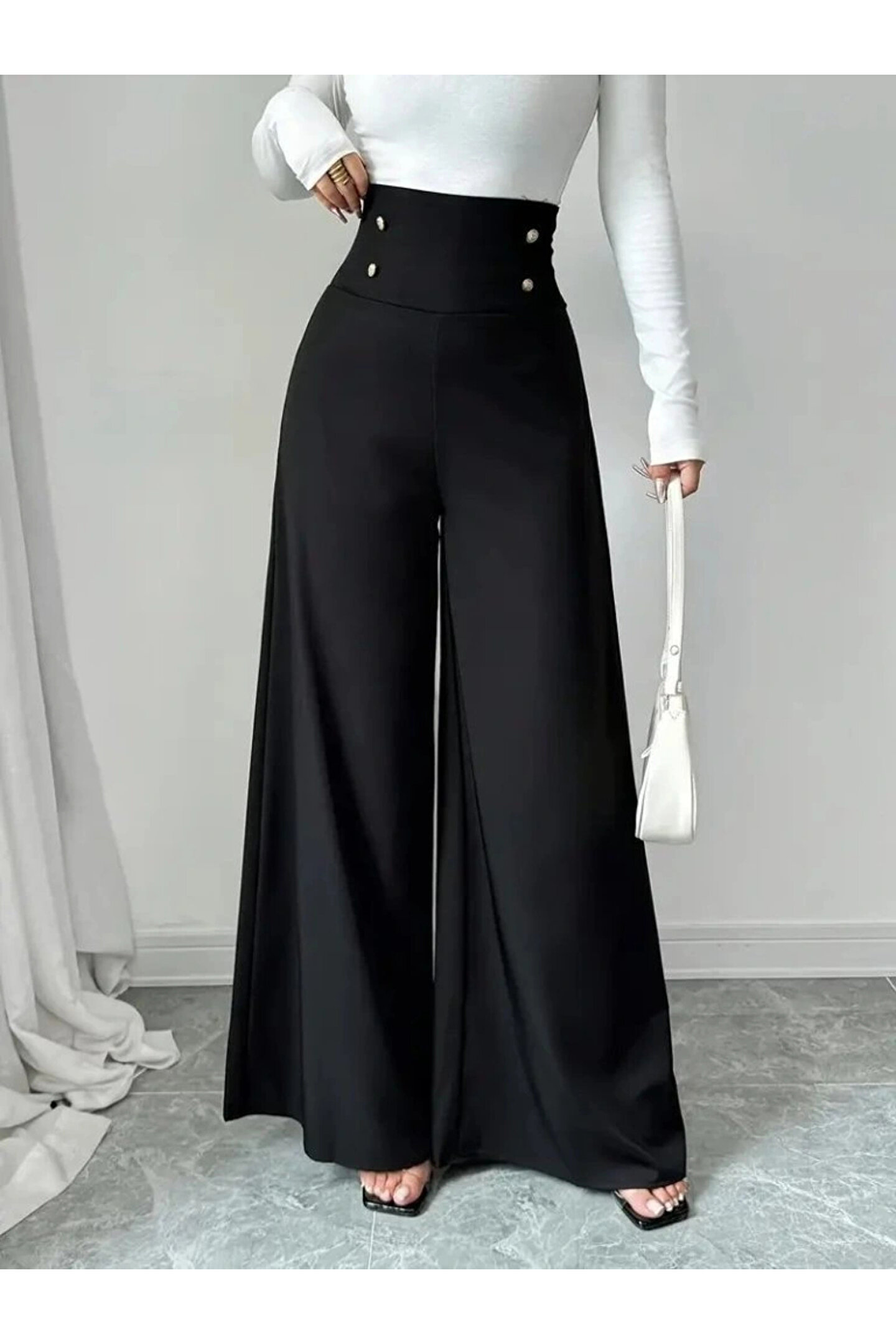 BEFAON Kadın Yüksek Bel Düğmeli Geniş Paçalı Ithal Krep Pantolon