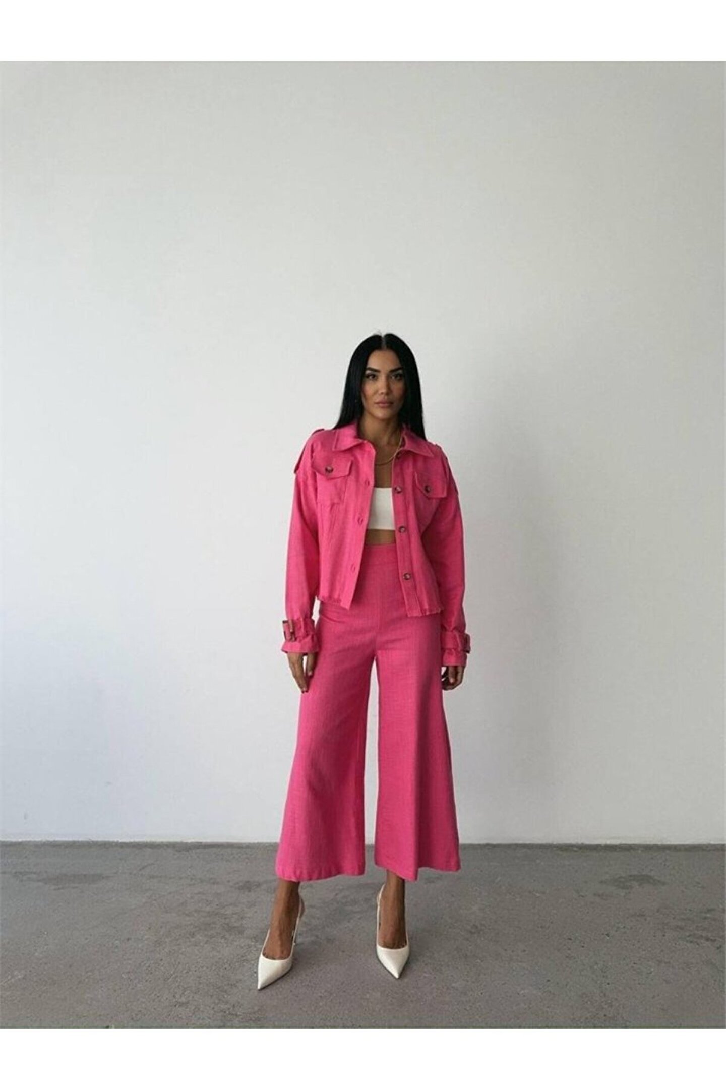 KETEN PÜSKÜL DETAYLI GÖMLEK-PANTOLON TAKIM - Fuşya