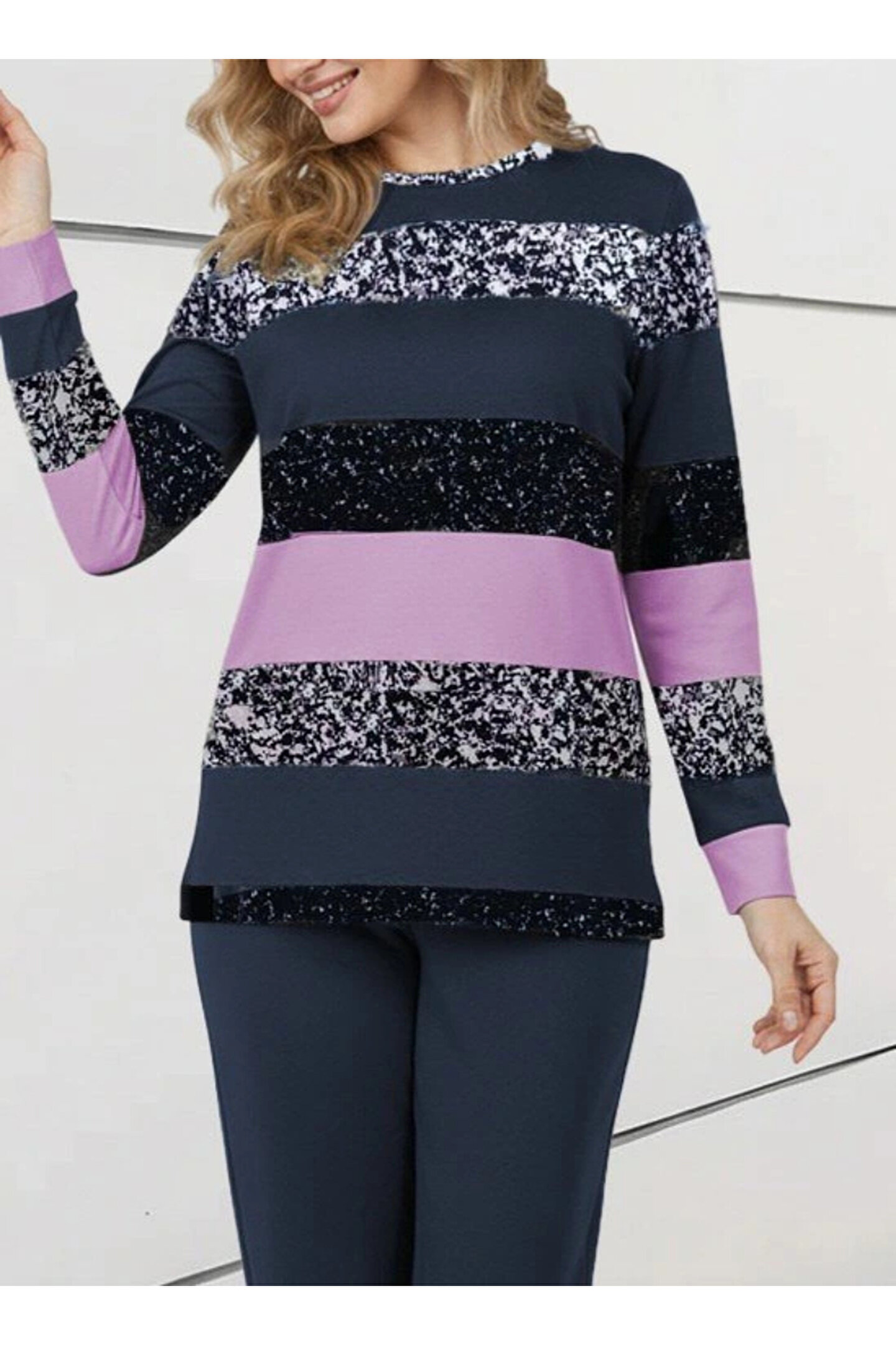 BEFAON MDB Kadın Uzun Kollu Bisiklet Yaka çizgili Desen Iki Iplik Bluz Ve Pantolon Ikili Takım