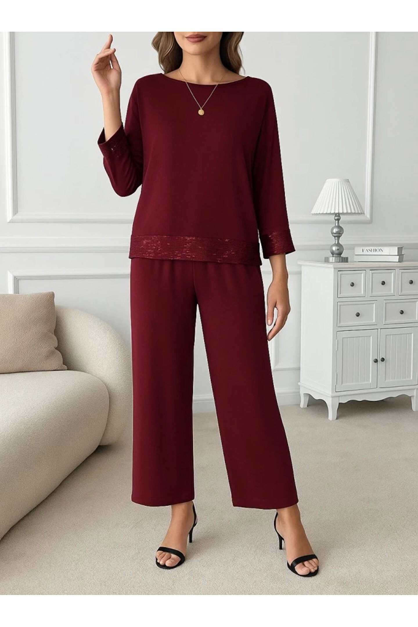 Kadın Uzun Kollu Bisiklet Yaka Pulpayetli Viskon Iki Iplik Bluz Ve Pantolon Ikili Takım