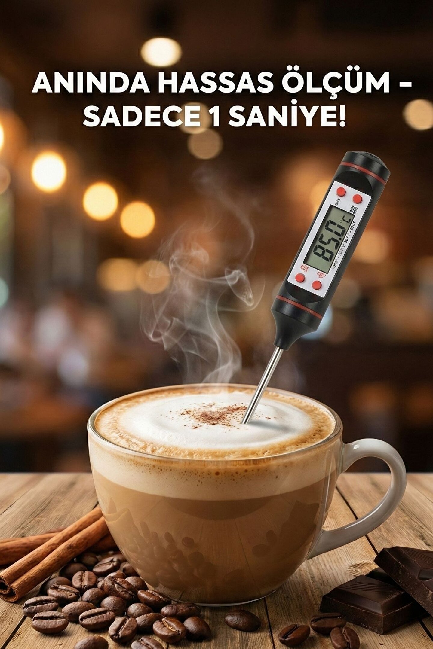 Mutfakta Mükemmelliğin Anahtarı: Hassas Dijital Gıda Termometresi Yemeklerinizin lezzetini ve kıvamını şansa bırakmayın! Bu dijital gıda termometresi, saniyeler içinde sunduğu hızlı ve hassas ölçümlerle mutfaktaki en güvenilir yardımcınızdır Çok Yönlü Kullanım: Etlerinizin (bonfile, tavuk, balık) tam istediğiniz gibi pişmesini sağlar.; Ayrıca bebek maması, süt, kahve, sos, yoğurt mayalama, eritilmiş çikolata ve hatta banyo suyu sıcaklığını ölçmek için idealdir.; Hızlı ve Hassas: Gelişmiş sensörü sayesinde sıcaklık değişimlerini anında algılar ve net LCD ekranında gösterir.; Geniş Sıcaklık Aralığı: Dondurulmuş gıdalardan kaynar sıvılara kadar (-50°C ila +300°C arası) geniş bir yelpazede güvenle ölçüm yapabilirsiniz.; Kullanımı Kolay ve Hijyenik: Uzun paslanmaz çelik probu, ellerinizi ısıdan korurken hijyenik bir kullanım sunar.; °C ve °F arasında kolayca geçiş yapabilirsiniz.;